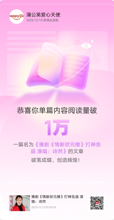 分享榮譽|豫劇《情斷狀元樓》演唱:詩然 閱讀量破萬啦!
