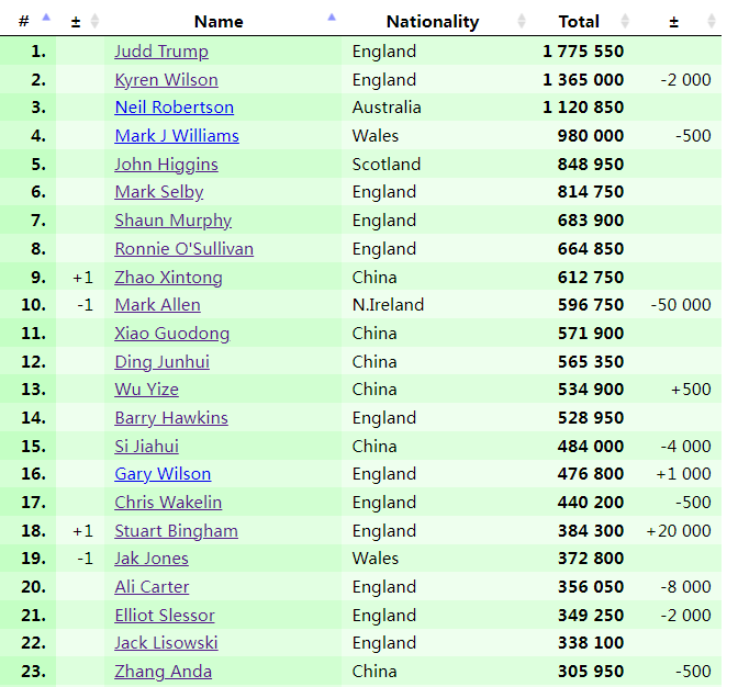 接下來,凱倫-威爾遜、尼爾-羅伯遜、馬克-威廉姆斯、約翰-希金斯、馬克-塞爾比、肖恩-墨菲、羅尼-奧沙利文排在第二到八。
