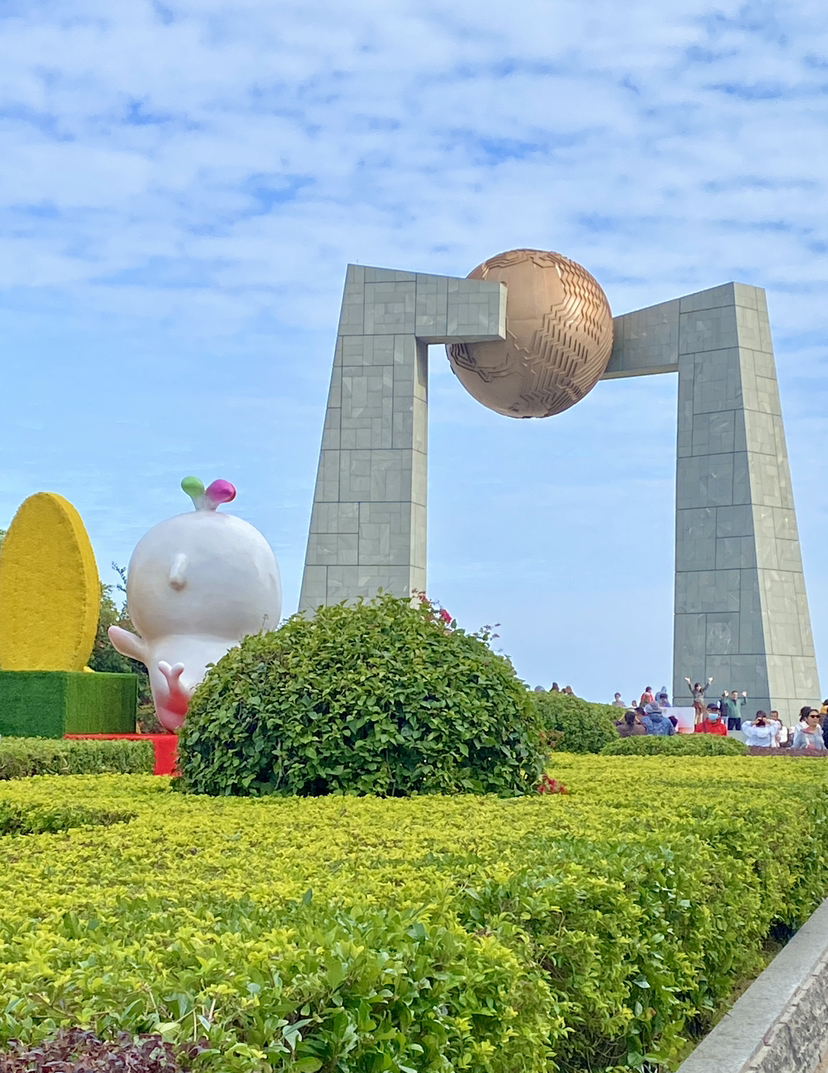 它由漢字"門(mén)"演變而來(lái),兩根傾斜23.5°的門(mén)柱托起金色球體,象征地球與北回歸線(xiàn)的時(shí)空交匯。