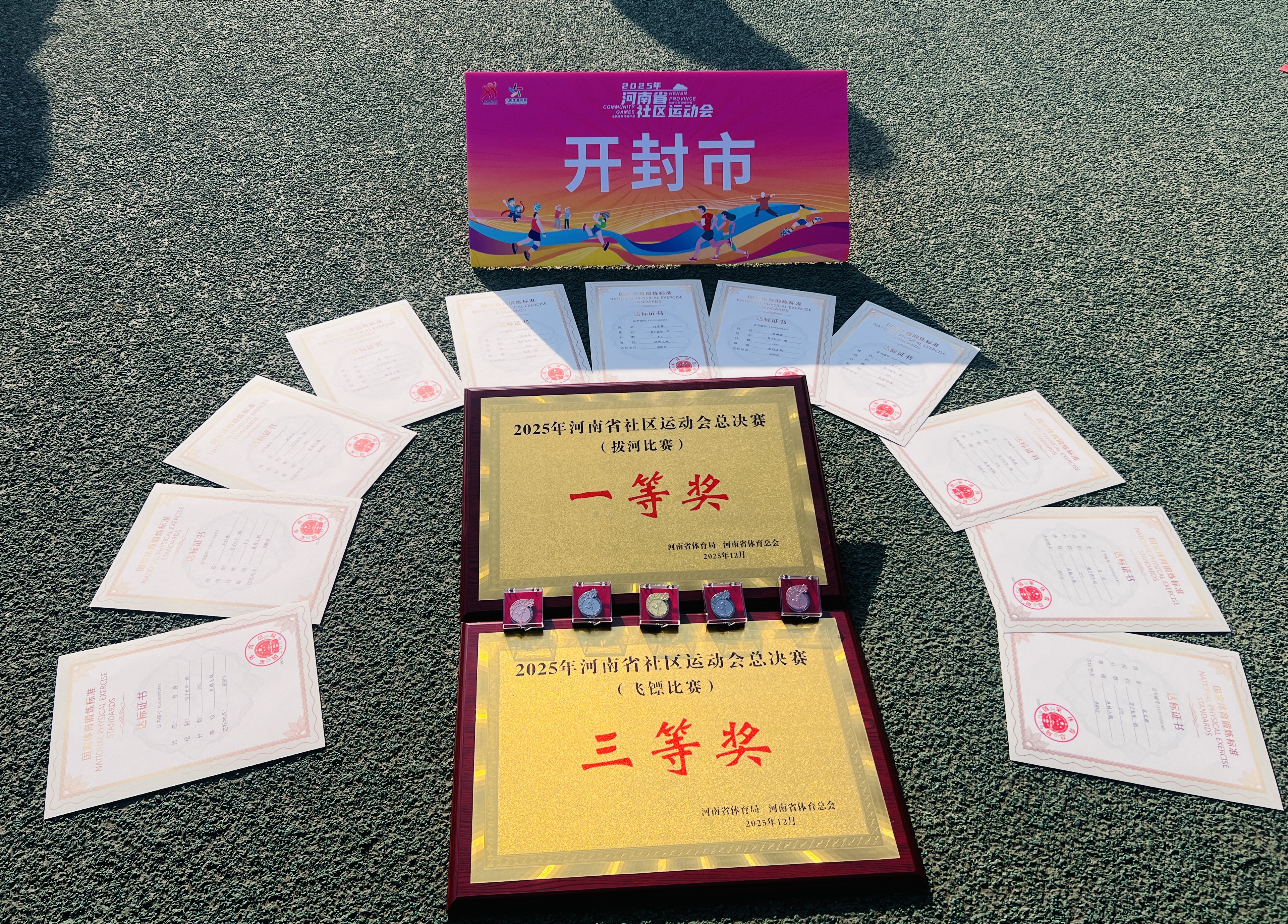 2025年河南省社區運動會總決賽設置1分鐘仰臥舉腿、30秒跳繩、3000米快走、繞桿跑等國家體育鍛煉標準達標測驗,拔河、飛鏢等競賽項目,廣場舞、空竹、健身氣功、新疆舞等展演項目,投壺、射箭等體驗項目。拔河比賽中,開封代表隊選手在賽場上團結協作,盡顯古都健兒的活力與風采,斬獲拔河比賽一等獎第一名。此外,開封代表隊榮獲飛鏢比賽三等獎,以及國家體育鍛煉標準達標測驗金、銀、銅獎。
