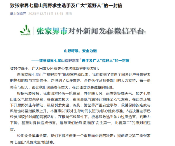 本賽事以“野外生存時間長短”為核心勝負標準,8名決賽選手已經參加較長時間的競賽活動,在極端氣候條件下,極易導致選手體力過度透支、判斷力下降,甚至對身體造成傷害。經組委會慎重會商,決定提前結束第二季張家界七星山“荒野求生”挑戰賽。