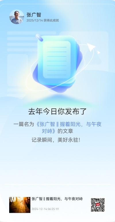 【作者簡介】張廣智,河南上蔡人,現居駐馬店。省轄市報社資深副刊編輯、記者。河南省作家協會會員、駐馬店市詩歌學會副會長。作品散見《詞刊》《星星詩刊》《詩歌月刊》《中國詩人》《散文詩》《時代文學》《鴨綠江》《歲月》《奔流》《大河詩歌》《河南詩人》《天津詩人》《山東詩人》《四川詩人》《牡丹》《躬耕》《大觀》《新家庭》《人生與伴侶》《河南日報》《農民日報》《中國婦女報》《中國新聞出版報》等全國各地報刊。入選《中國百年新詩經》《新世紀詩選》《2015中國詩歌選》《中國百年詩人新詩精選》《中國網絡詩歌年鑒》《2014-2015中國年度詩人作品精選》《中國散文詩2021》《中國詩人生日大典》《河南文學作品選(詩歌卷)》等多種選本。出版詩集《串起心情的碎片》。