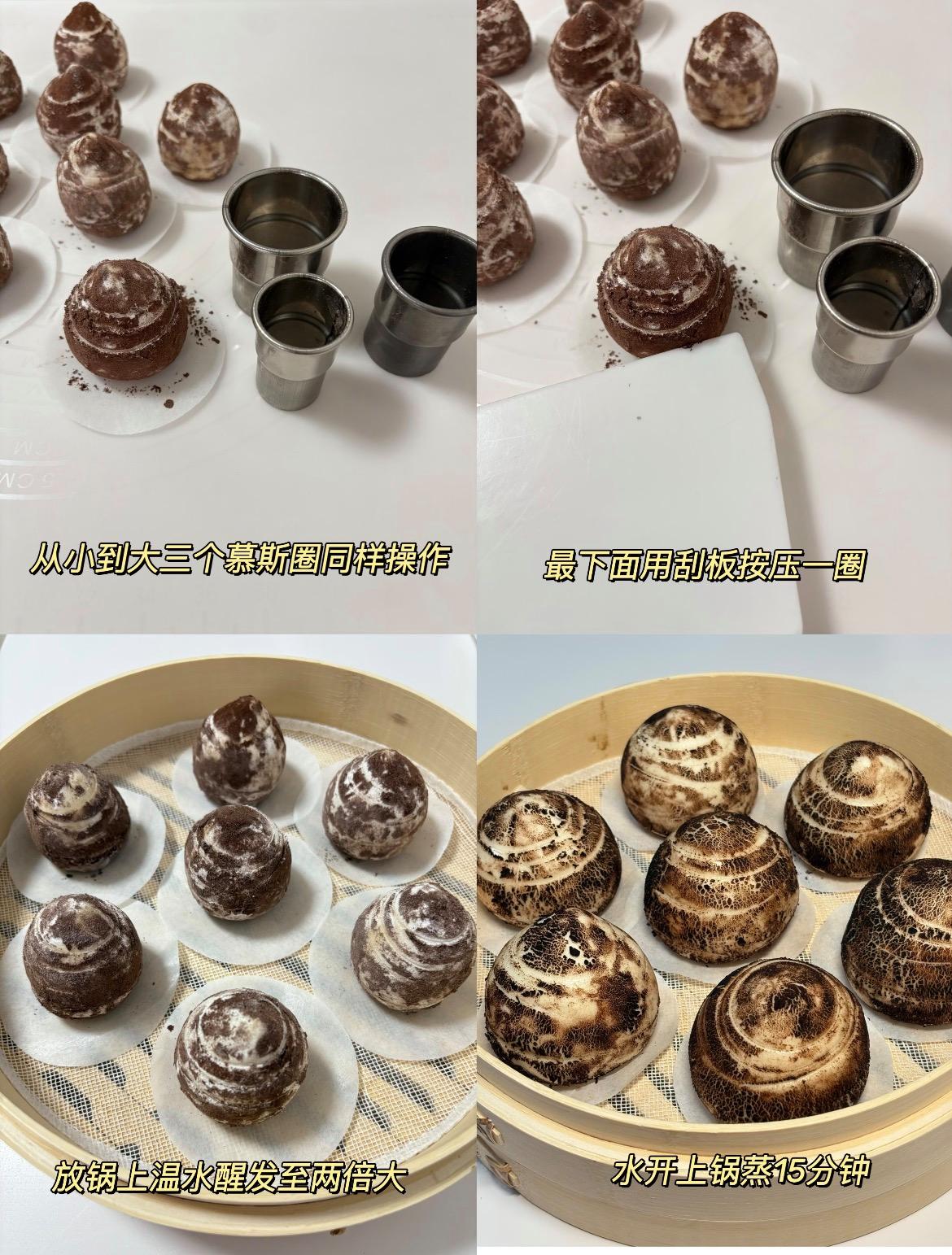 3、準備三個從小到大的慕斯圈,在內壁抹少許油防粘。將生坯收口朝下放入,用刮板沿慕斯圈內壁輕輕按壓一圈,使其貼合并形狀規整。將套著慕斯圈的生坯放在蒸鍋內,溫水環境下發酵至近兩倍大。