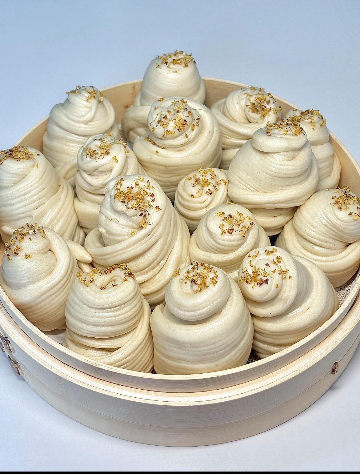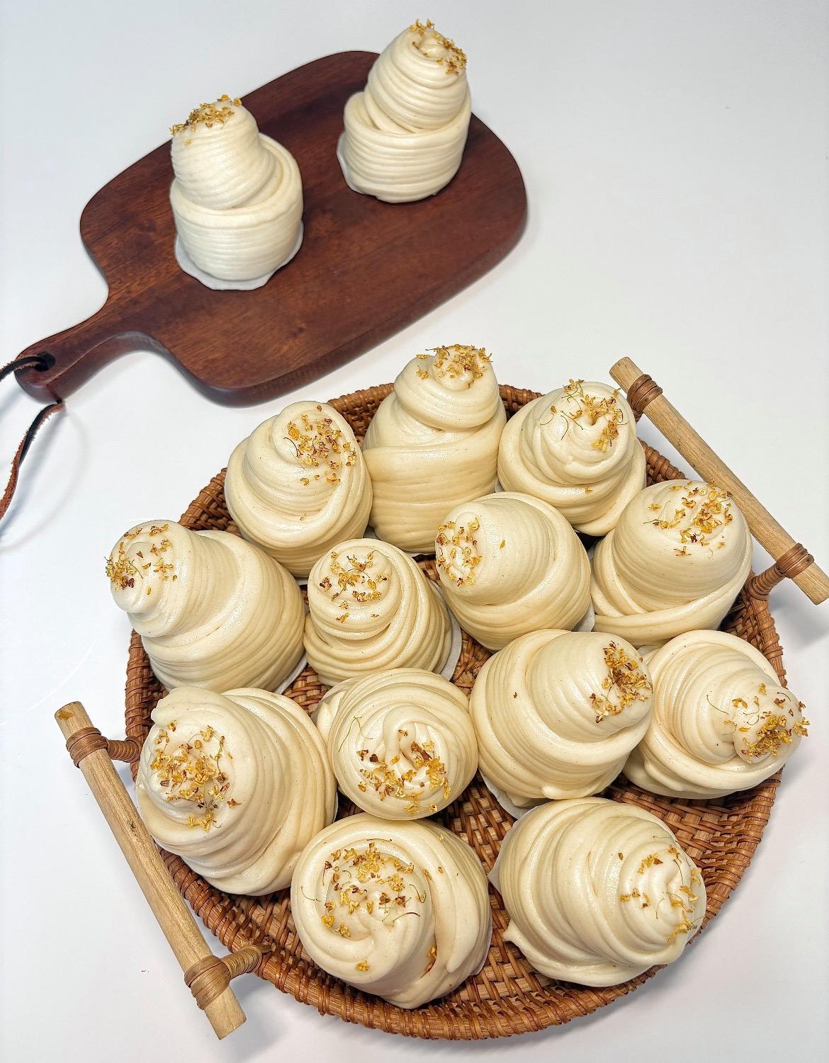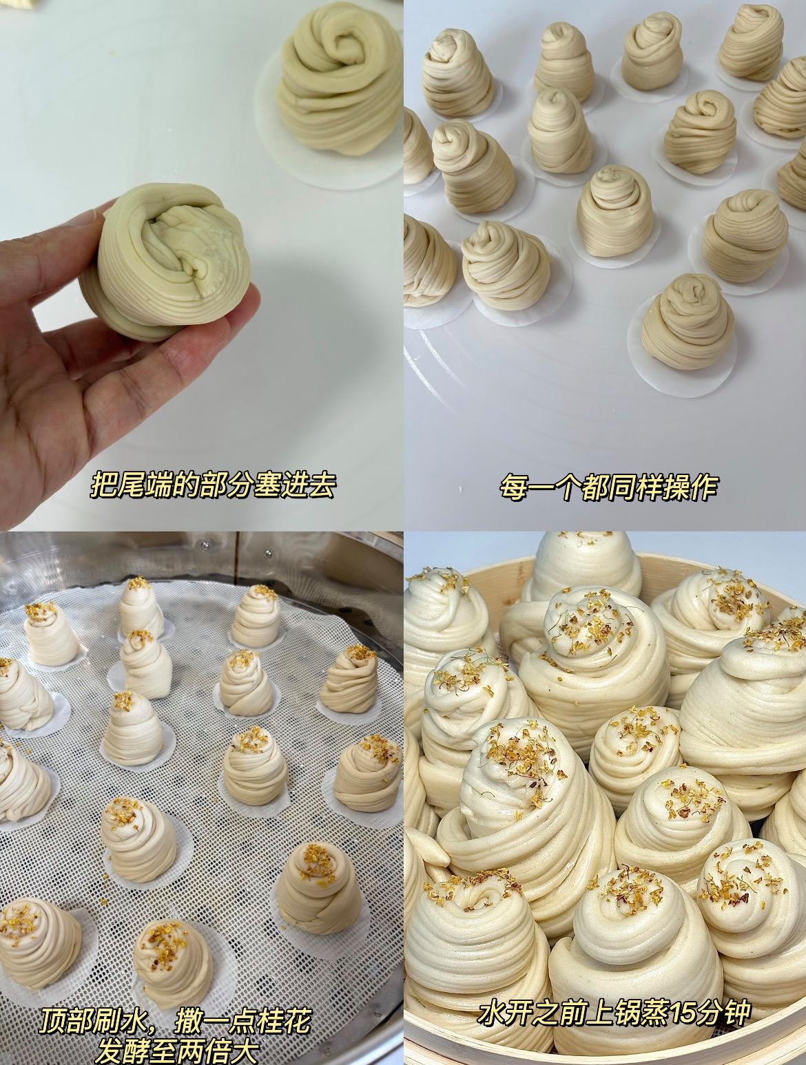 4、將所有做好的花卷生坯放入蒸籠,在溫暖處發酵至約兩倍大。發酵好后,在頂部刷上少許清水,撒上幾粒干桂花。冷水上鍋,水開后開始計時,用中火蒸15分鐘。關火后燜3分鐘再揭蓋。