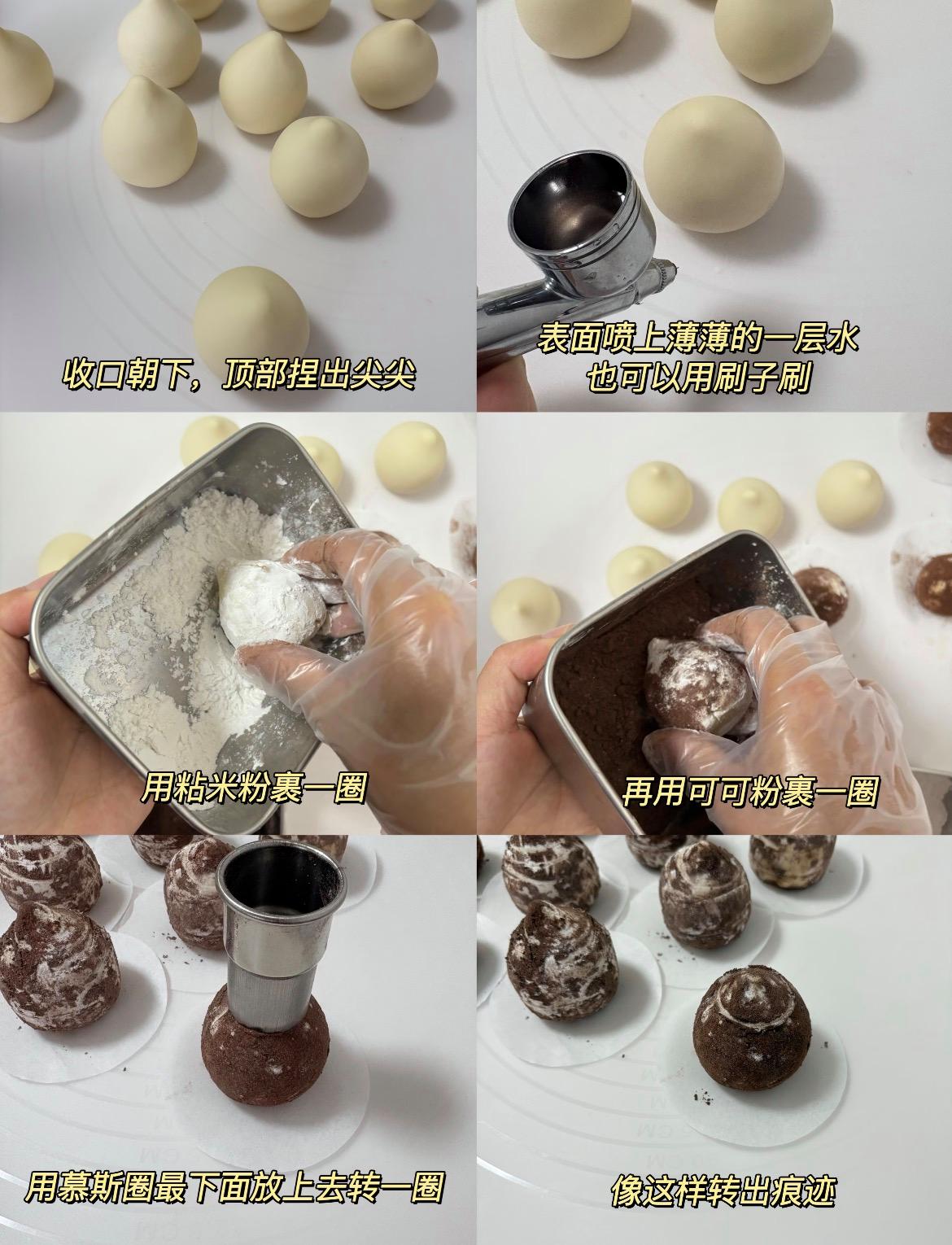 2、在生坯表面噴或刷一層薄水,先放入糙米粉中滾一圈,均勻裹上。再放入可可粉中,僅裹下半部分(或側邊),形成自然漸變。取一個慕斯圈,在裹好粉的生坯側面及頂部輕輕按壓并旋轉一圈,刻出環形紋路。