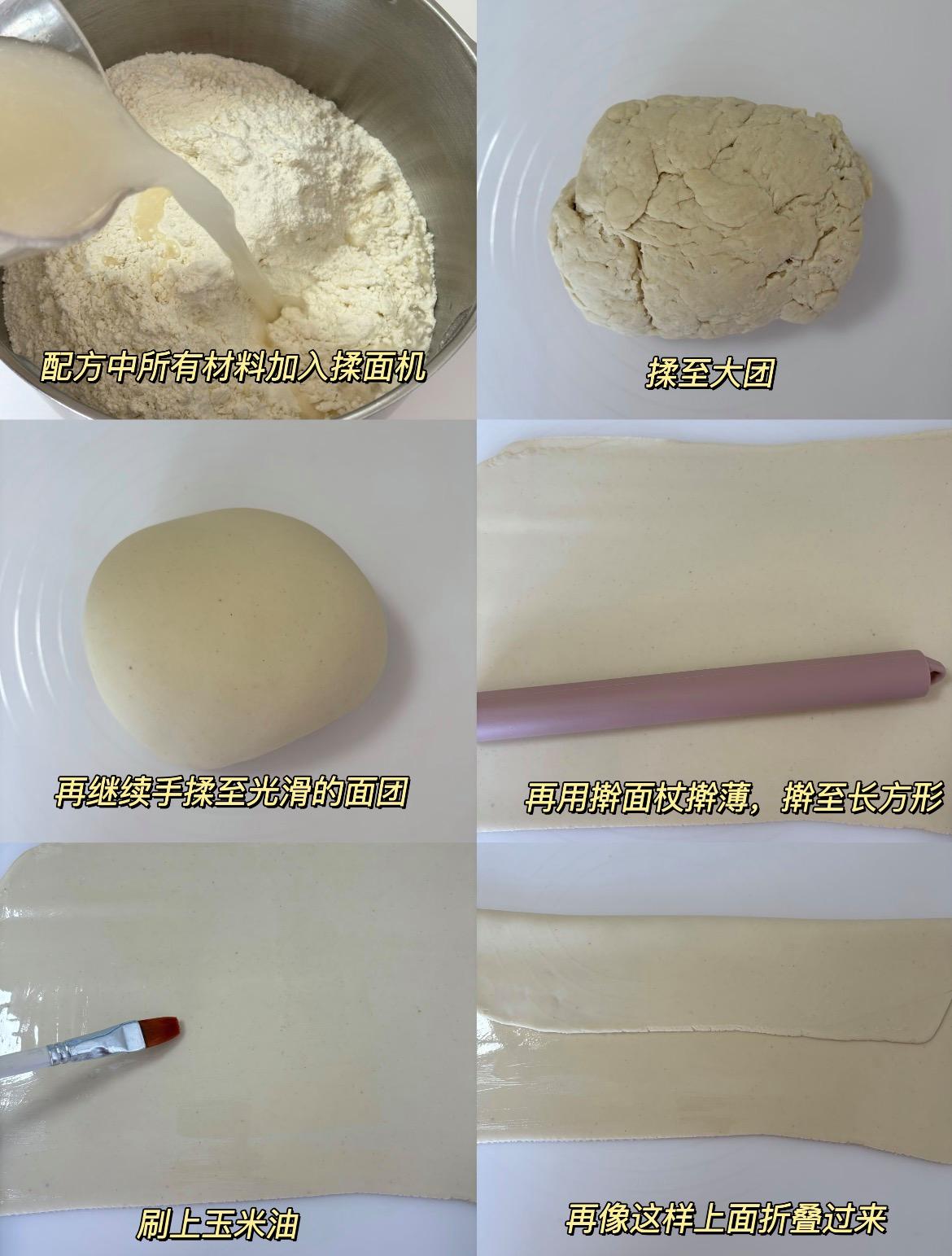 1、將面粉、酵母、白糖和溫水(少量多次加入)全部放入揉面機中,揉成一個大面團。取出放在案板上,繼續手揉至表面光滑。用搟面杖將面團搟成一個長方形的大面片,表面均勻刷上一層薄薄的玉米油。將面片的上半部分向下折疊三分之一。