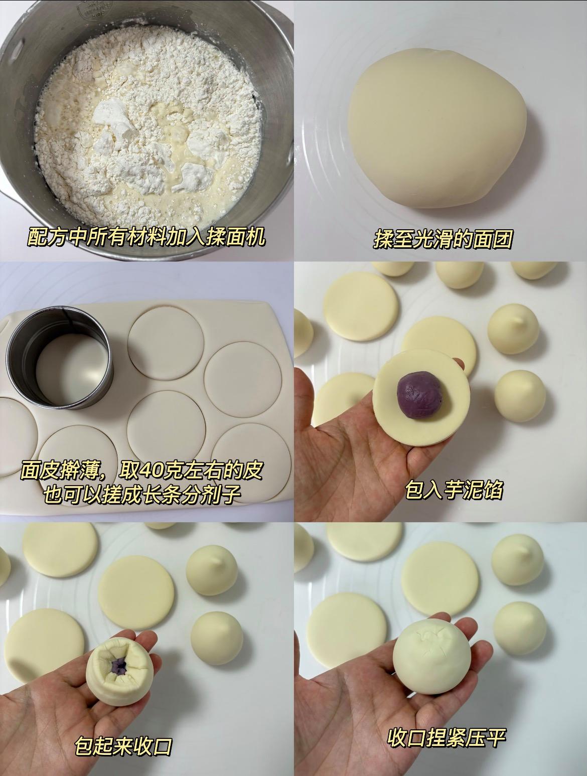 1、將面團所有材料放入揉面機,揉成光滑柔軟的面團。取出后搓成長條,分成約40克一個的劑子。將劑子搟成中間厚邊緣薄的圓皮,包入適量芋泥餡,用虎口收攏,捏緊收口后輕輕壓成扁圓形。