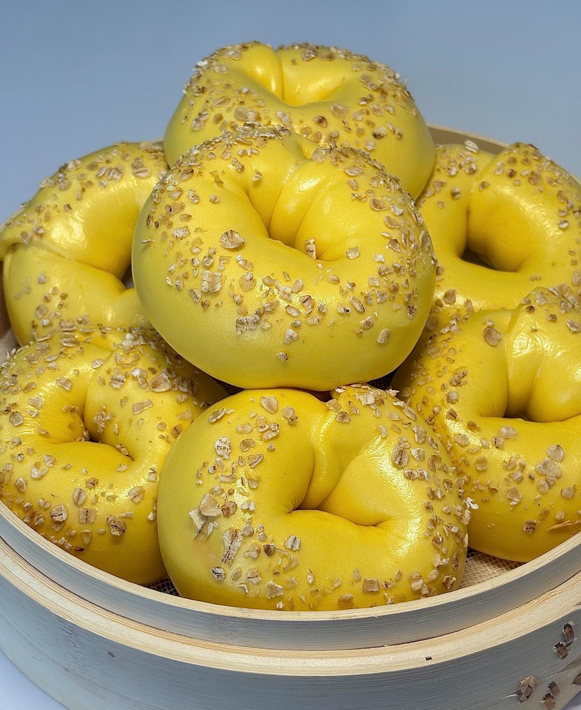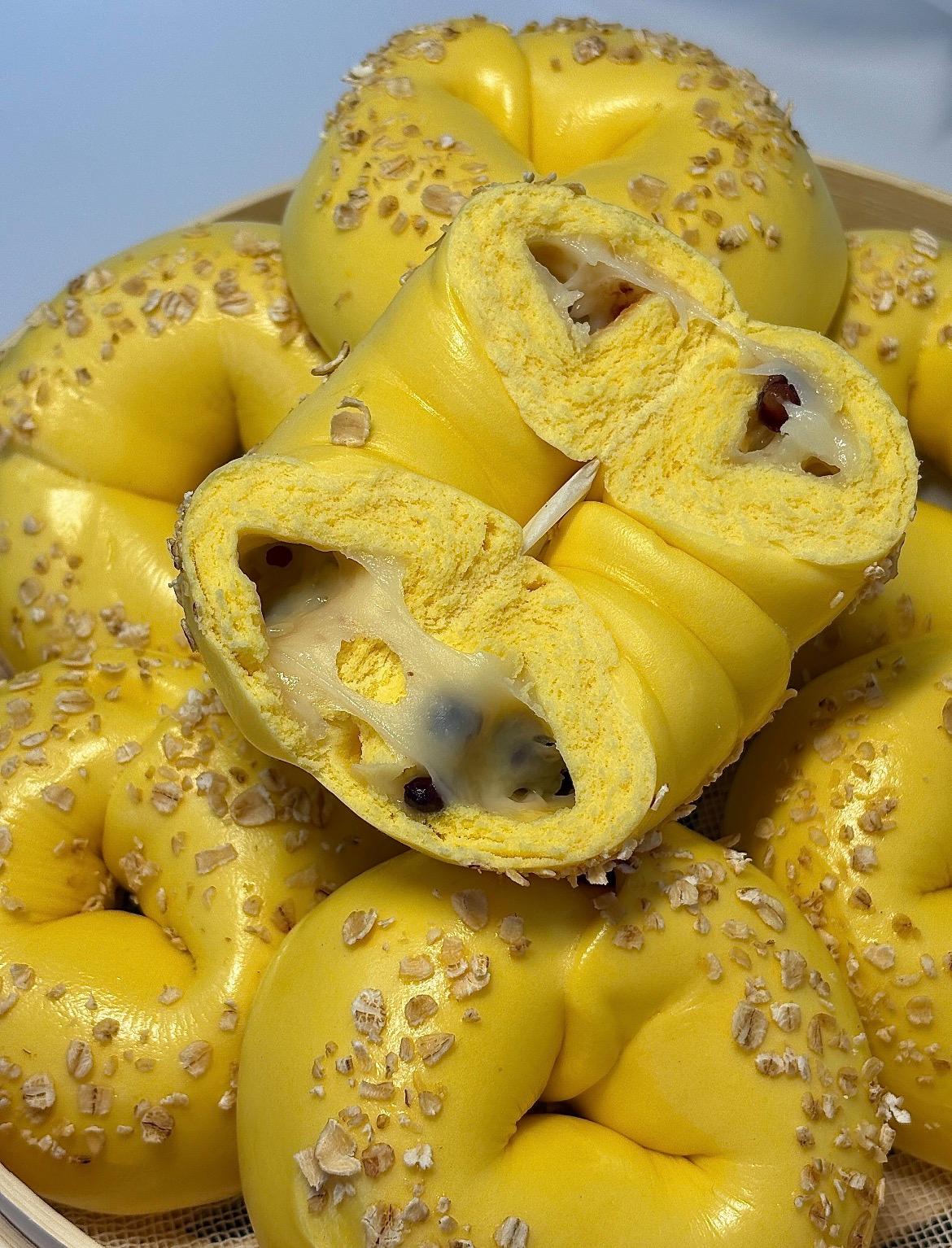4、整形好的面卷表面刷一層清水,在燕麥片里滾一圈,使其均勻沾上燕麥。放入蒸籠,蓋上蓋子,在溫暖處發酵至1.5-2倍大。水開后上鍋,中火蒸17分鐘,關火燜3分鐘再開蓋。