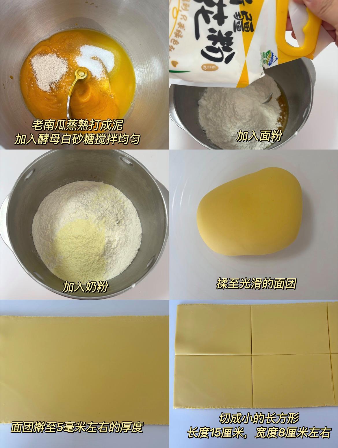 2、老南瓜去皮切塊蒸熟,壓成細膩的南瓜泥。南瓜泥溫熱時加入酵母和糖攪勻,再加入奶粉和面粉,揉成一個光滑柔軟的面團。將面團搟開,切成寬度約3厘米、長度15厘米左右的長方形面片。