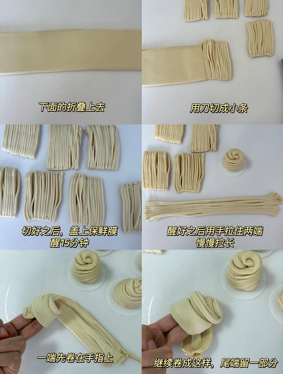 3、切好的面條蓋上保鮮膜,靜置醒發15分鐘。取一條醒好的面,用手輕輕捏住兩端,慢慢拉長。將一端先繞在手指上作為中心,然后繼續纏繞,尾端留出一小段。最后,將這截尾端輕輕塞入卷好的花卷底部,壓緊固定。其余面條同樣操作。