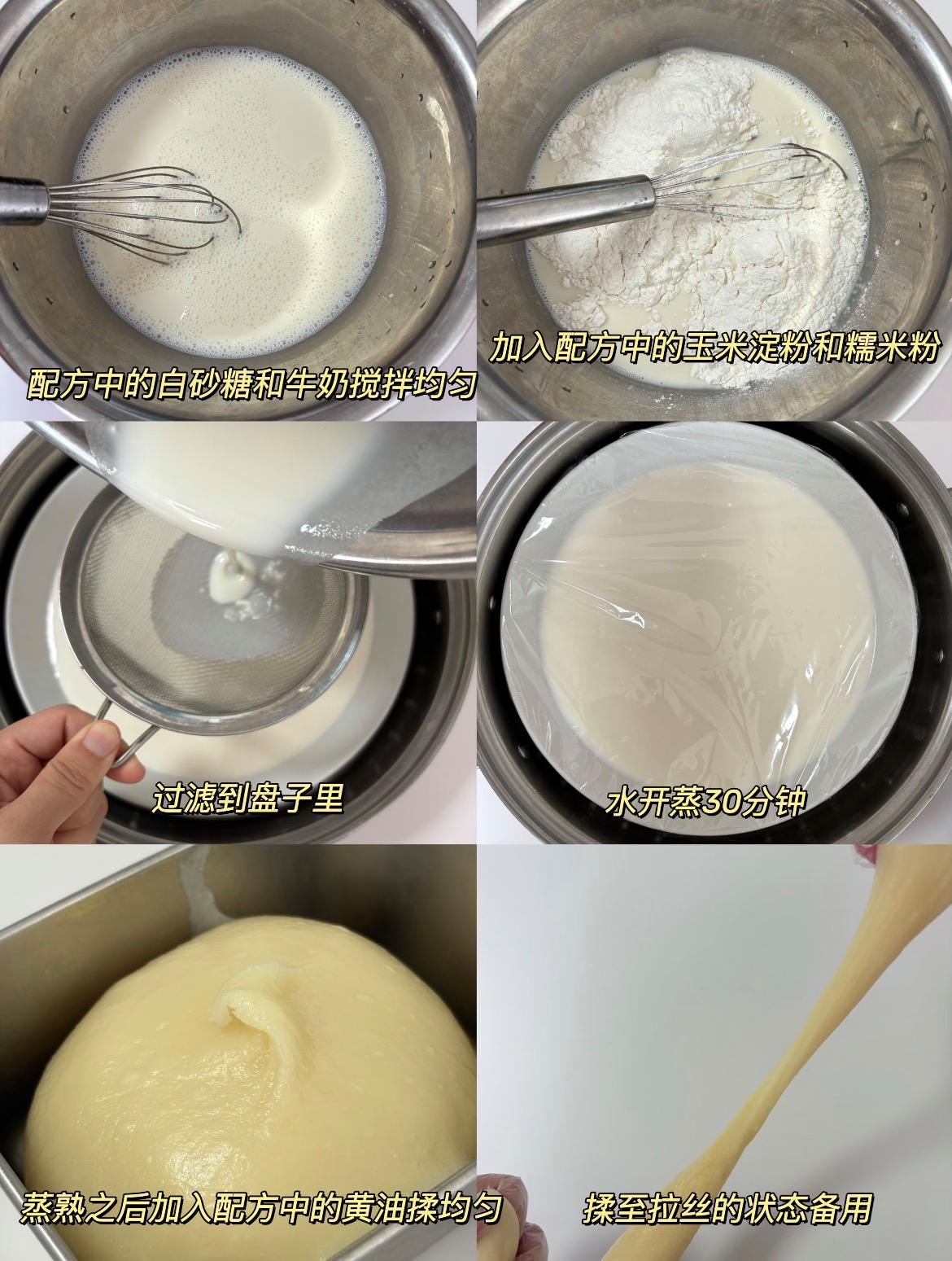 1、將麻薯配方中的牛奶和白砂糖攪拌均勻,加入玉米淀粉和糯米粉,攪拌至順滑無顆粒。過濾到一個平盤里,水開后上鍋,中火蒸30分鐘至完全凝固。趁熱加入黃油,戴手套反復揉搓、拉扯,直至麻薯團能拉出長絲,備用。