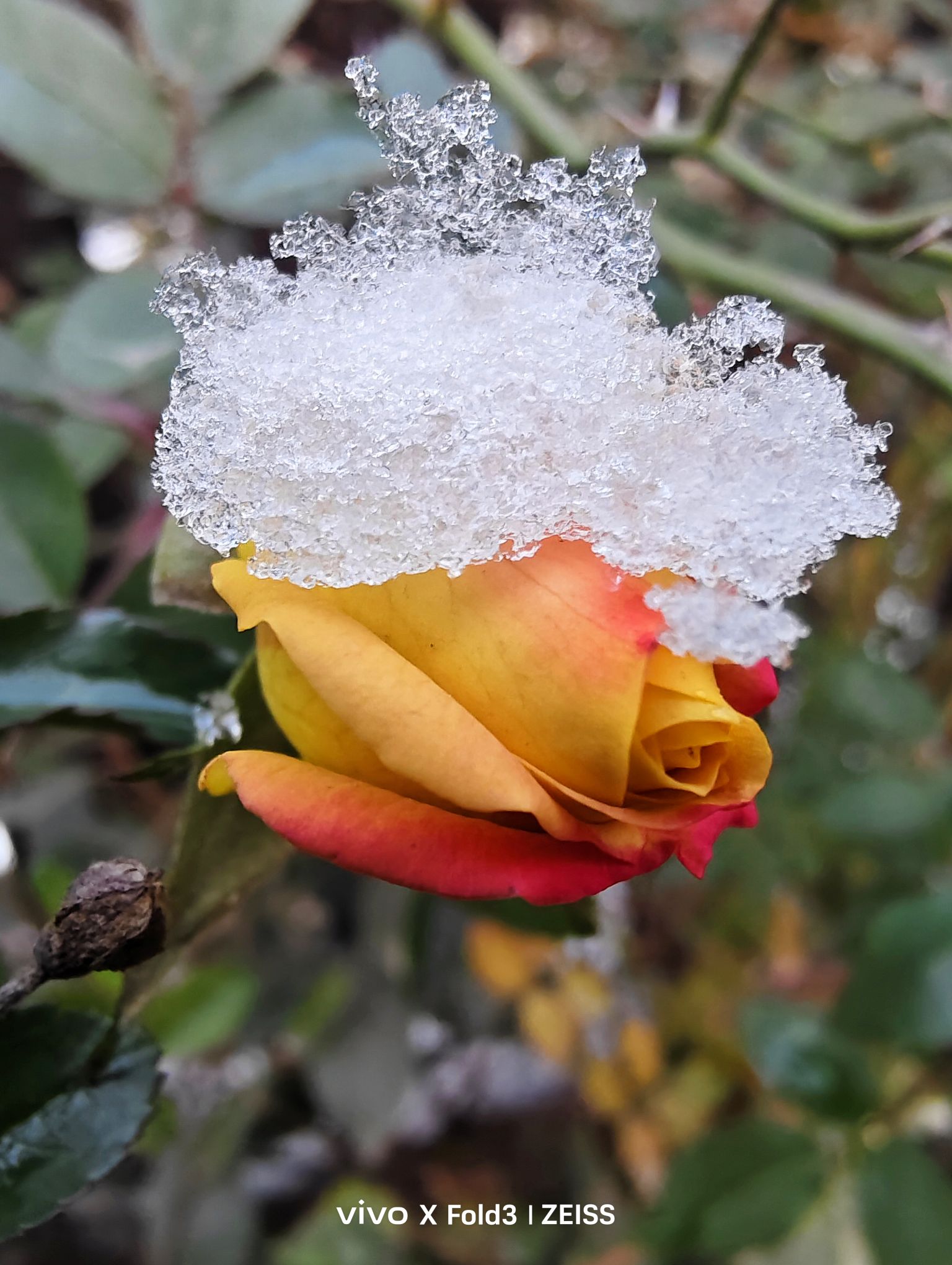 雪粒簌簌落下,沾在花瓣上又慢慢融化,薔薇依舊挺立。它用一朵花的倔強,詮釋著生命最動人的姿態,也讓這個立冬,因這抹鮮活的色彩,多了一份溫暖與力量。