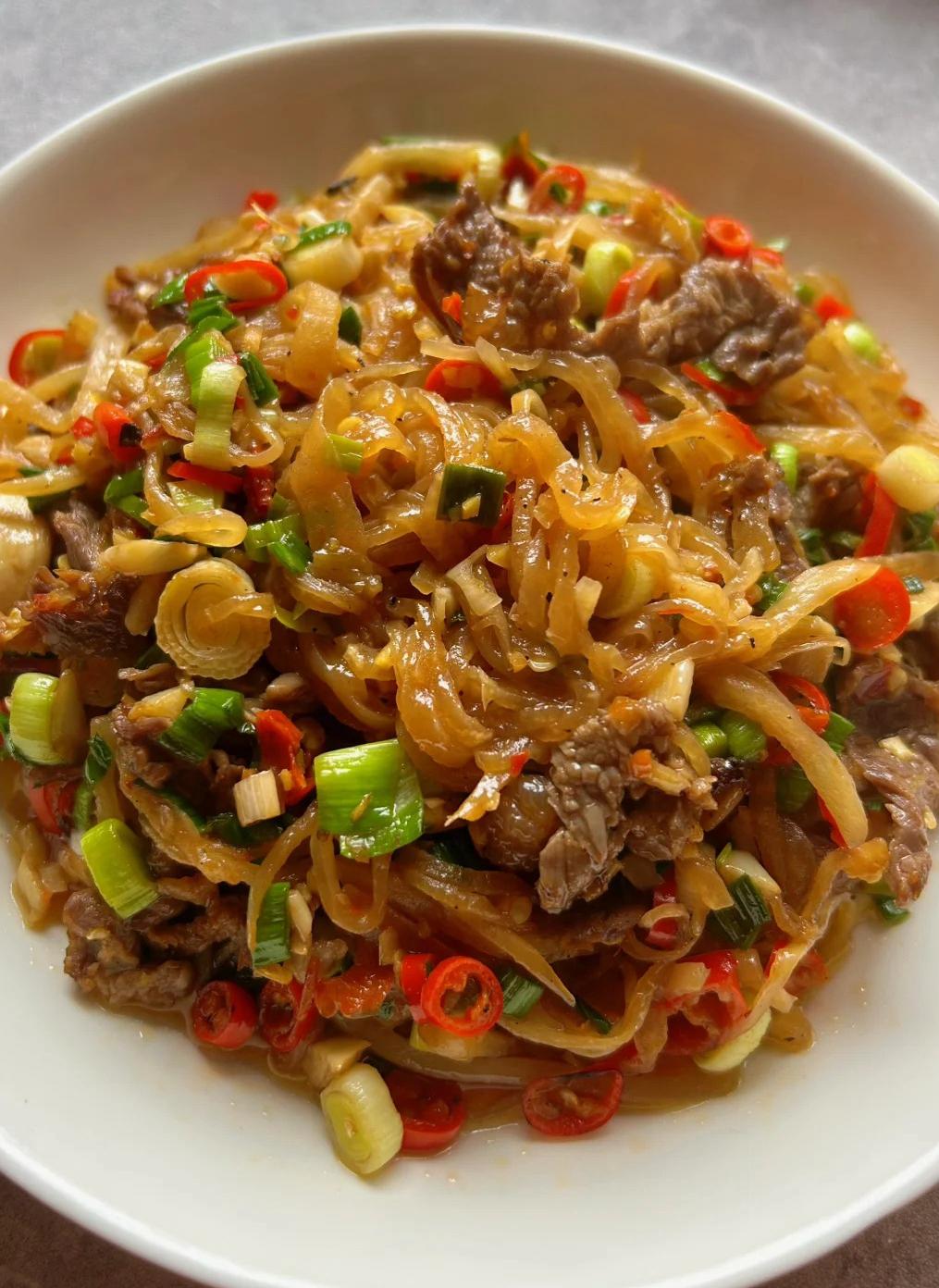 小嘮叨: 很多人炒牛肉愛用嫩肉粉或小蘇打,其實用紅薯淀粉腌制效果就很好。它能在牛肉表面形成一層薄薄的保護膜,鎖住水分,使肉絲更滑嫩,而且沒有怪味。蘿卜絲不殺水,利用它自身的水分來“煮”自己,更能保持原味。