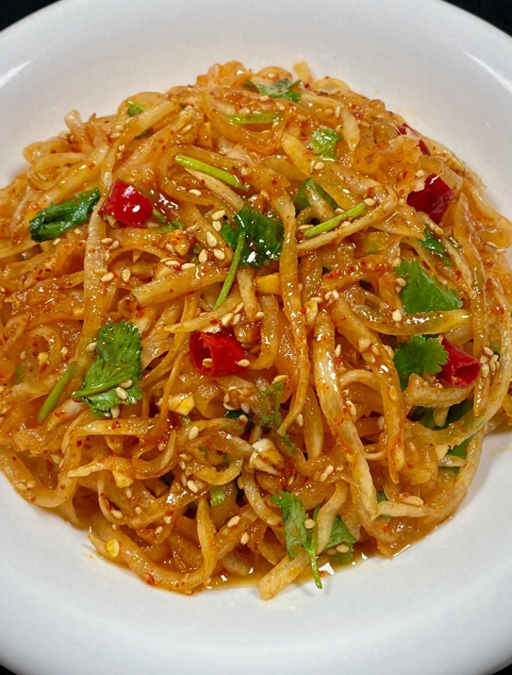 但這份涼拌蘿卜絲,不一樣。它不是冰鎮的寒涼,而是爽口的清新。大魚大肉之前,來上幾筷子,胃口一下就打開了。它是宴席上最好的“清口前菜”,也是家常飯桌上最快的“解膩小能手”。