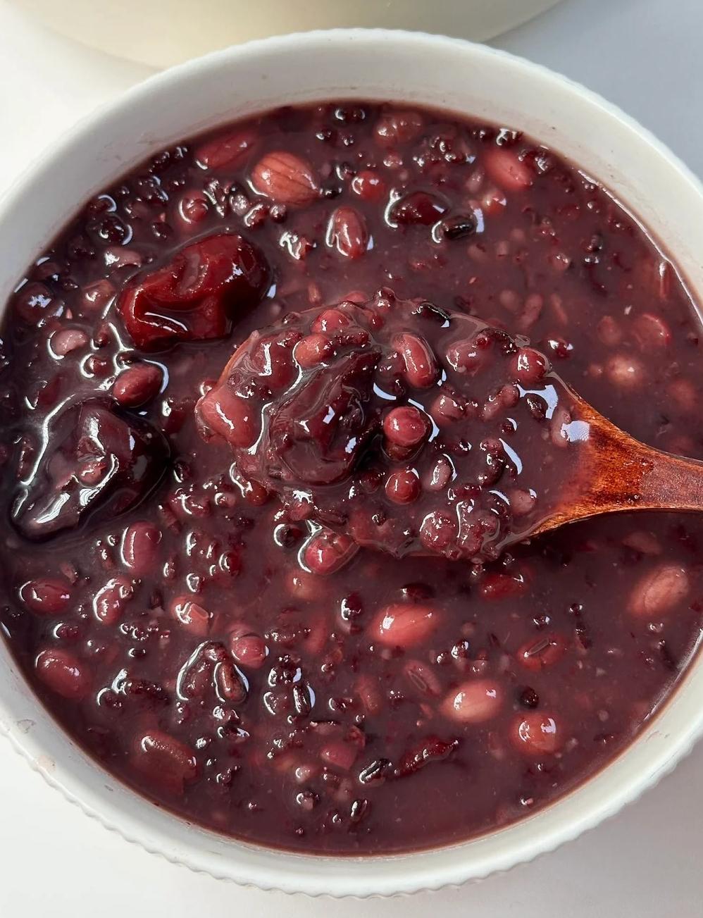 熬好的粥,是深紫發黑的顏色,油亮亮的。米油都熬出來了,表面結著一層厚厚的“粥皮”。用勺子一攪,粘稠得能拉絲。紅豆已經開了花,黑米軟糯,花生酥爛。每一口都扎實、綿密,帶著谷物天然的香氣。