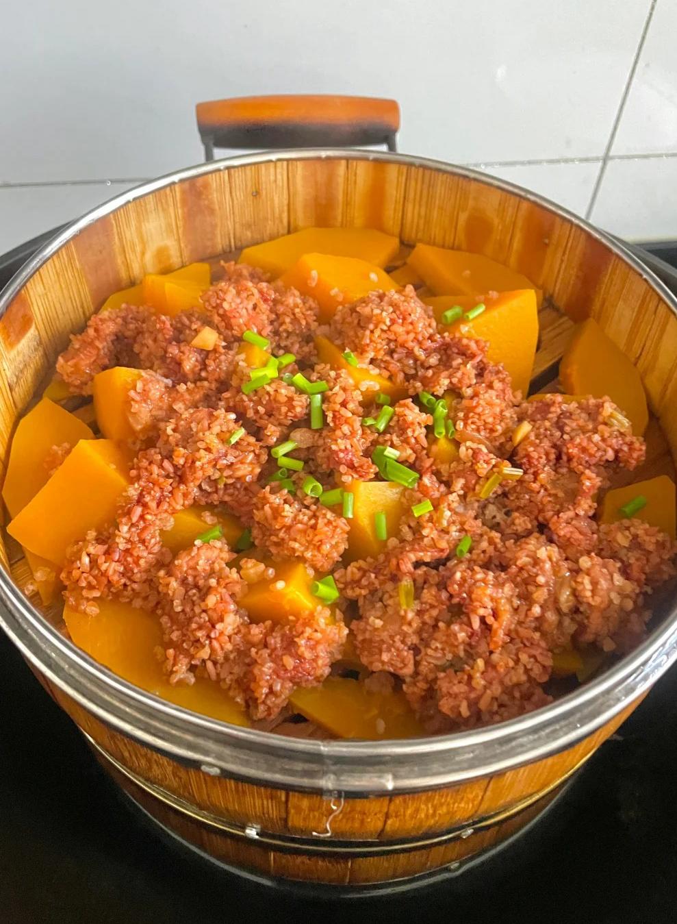 蒸好的南瓜,用筷子一戳就陷進去。顏色變得更深,像蜜糖一樣。裹著米粉的肉片,口感是酥松的,不油膩。一勺下去,南瓜的甜糯,肉的咸鮮,米粉的酥香,全部融合在一起。