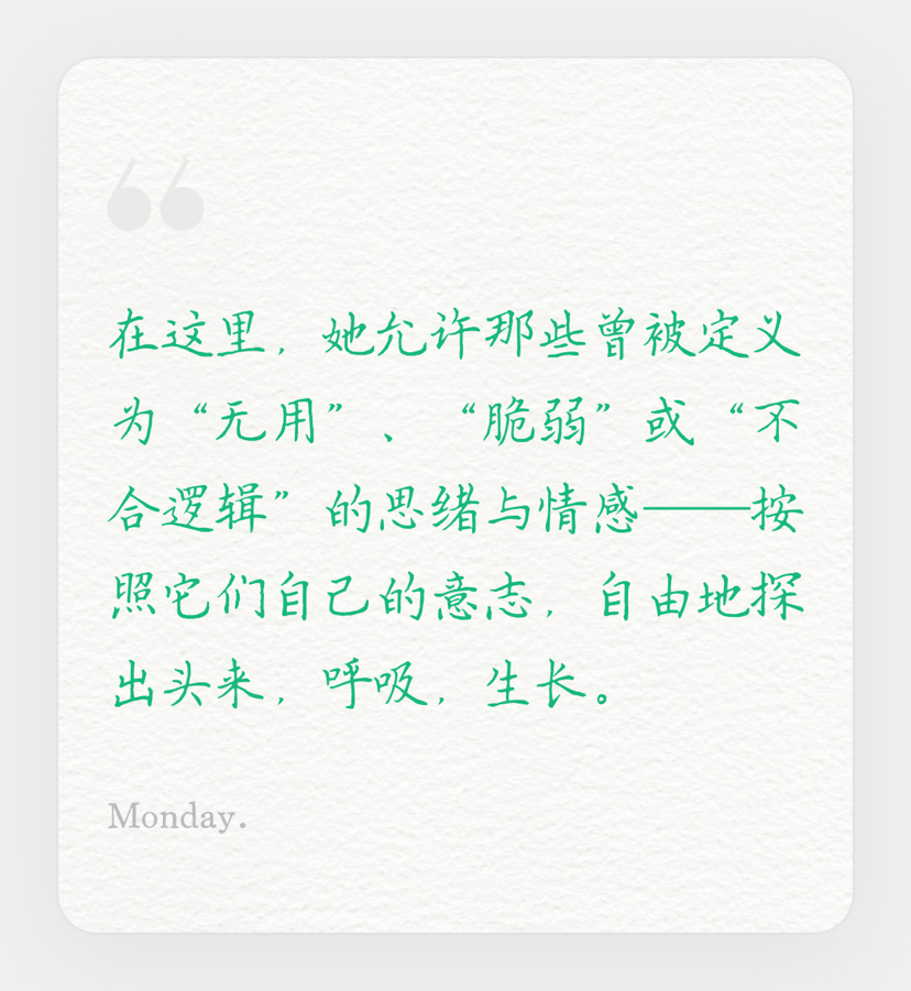 這更像是在她精心規劃、寸土寸金的精神花園里,她終于鼓起勇氣,悄悄留出了一小塊不被定義的野地。在這里,她允許那些不知名的、甚至是帶著細小尖刺的植物——那些曾被定義為"無用"、"脆弱"或"不合邏輯"的思緒與情感——按照它們自己的意志,自由地探出頭來,呼吸,生長。
