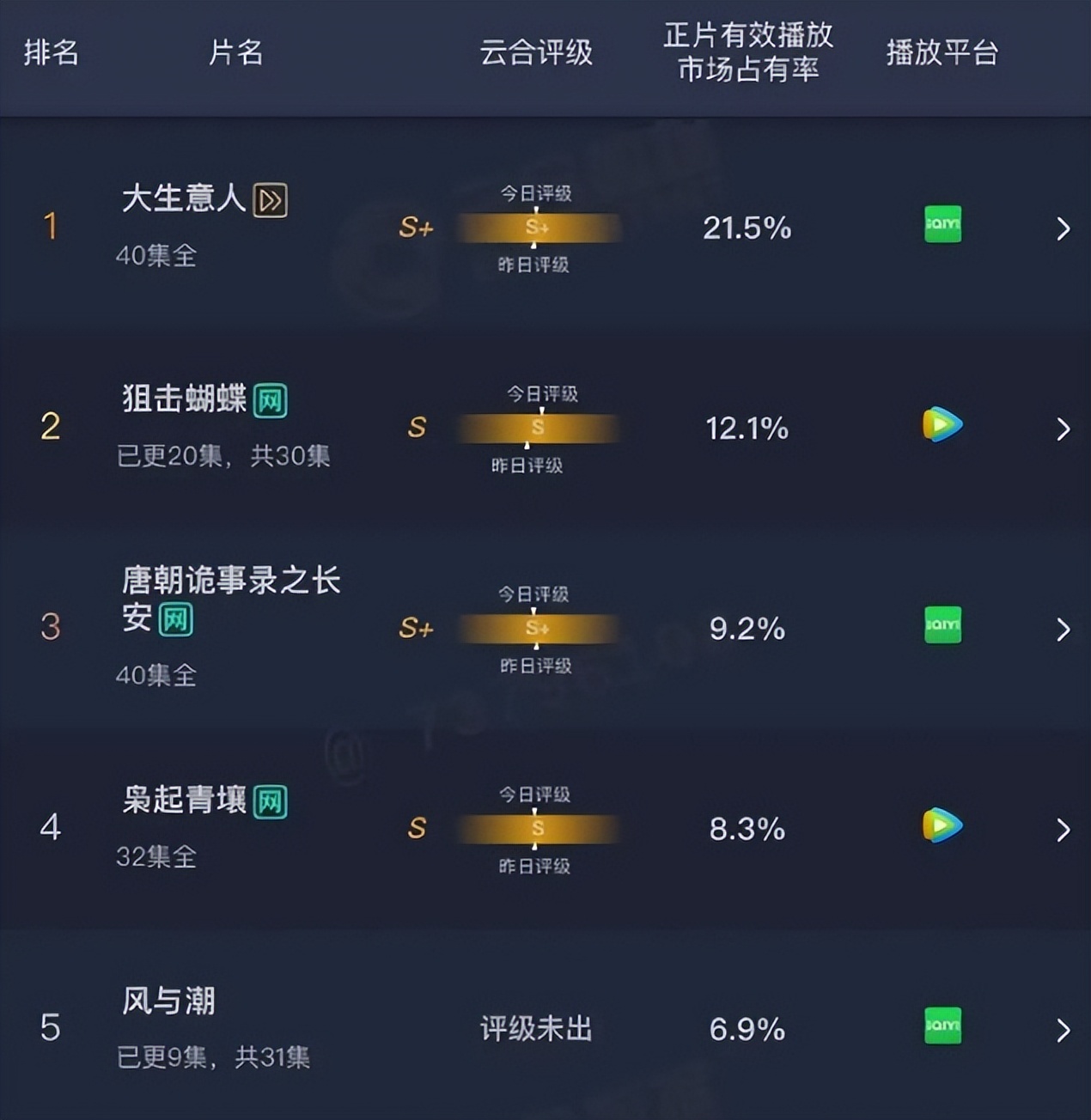 看到《大生意人》和《狙擊蝴蝶》都開播之后,“陳曉陳妍希新劇對打”話題就登上熱搜,然后,網友們就將這兩部劇放在一起進行對比,從目前的情況上看,《大生意人的》云合正片有效播放市場占比為21.5%,但這部劇已經迎來大結局,如果不出意外,占比肯定會下降。