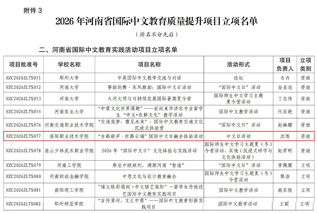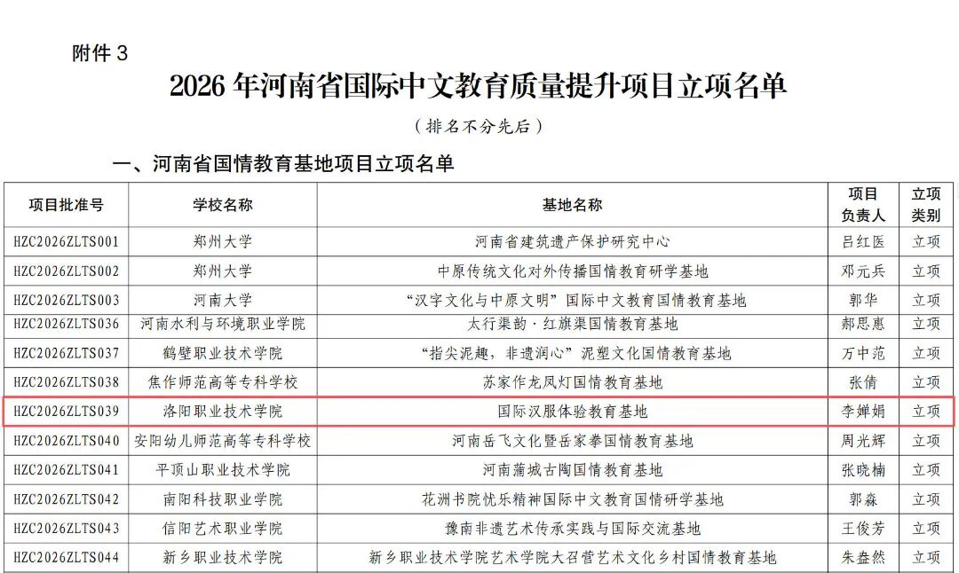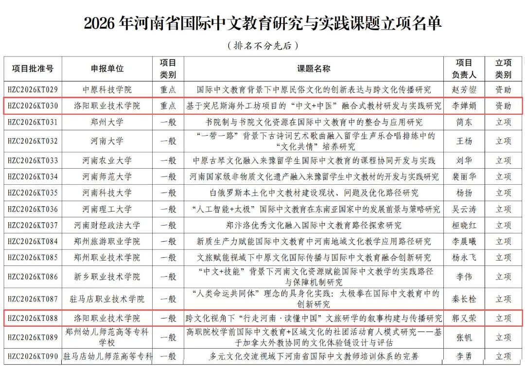 近日,河南省教育廳公布2026年河南省優質國際化課程、國際中文教育研究與實踐課題、國際中文教育質量提升項目立項名單。洛陽職業技術學院4個項目成功獲批立項。