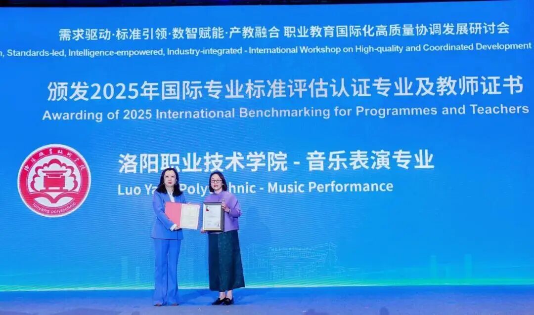 12月5日至8日,首屆博鰲職業教育發展大會暨國際產教融合展覽會在海南博鰲舉行。“需求驅動·標準引領·數智賦能·產教融合”職業教育高質量協調發展國際研討會上,發布了國際專業標準評估認證成果,洛陽職業技術學院音樂表演專業通過英國國家學歷學位評估認證中心(UK ENIC)國際專業標準評估認證,英國國家學歷學位評估認證中心、世界技能發展聯盟中國首席代表李華杰向學校頒發認證證書。