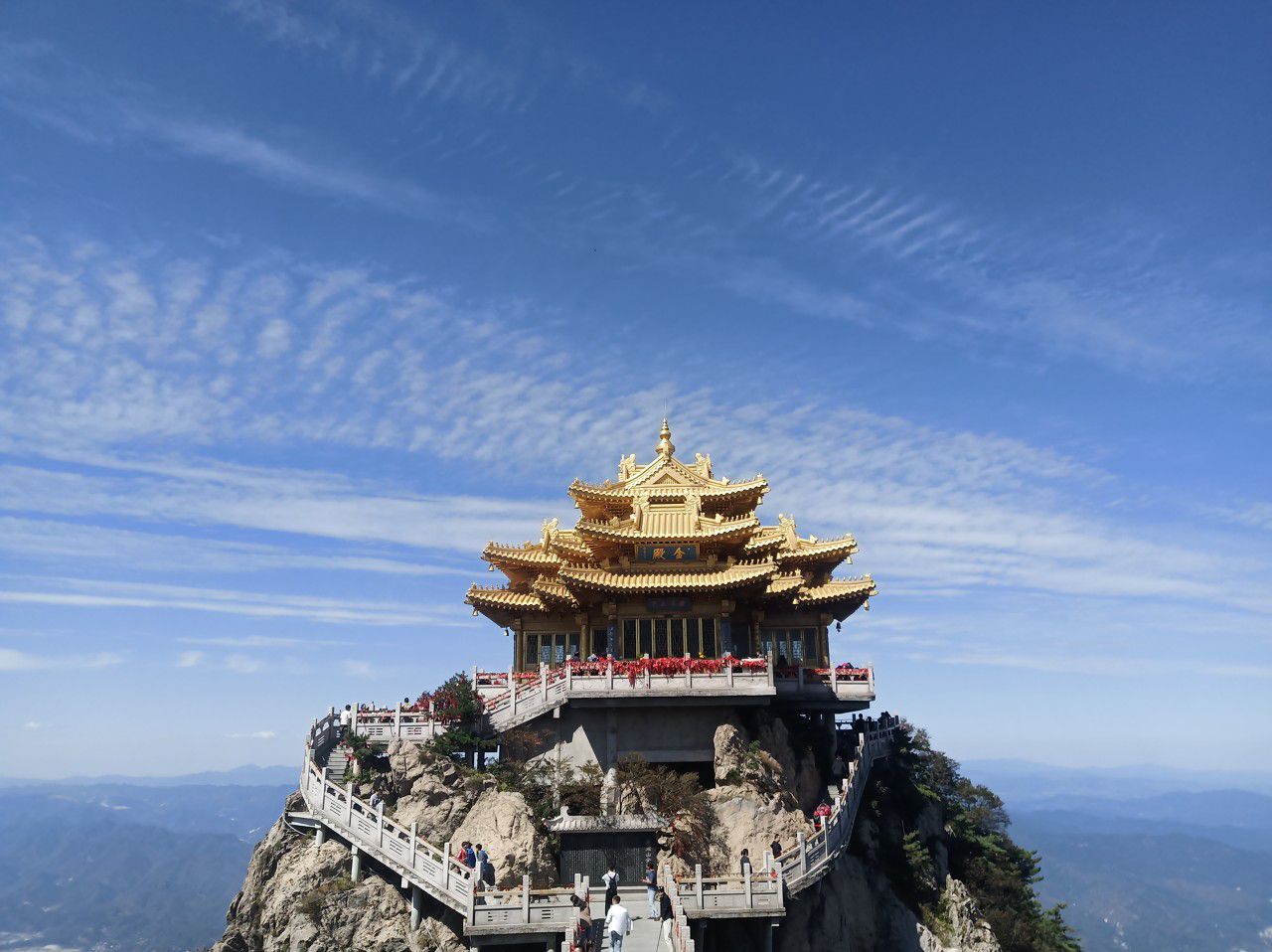 晴日里,云海平鋪在山巒之間,像老君鋪開的素箋,山尖是箋上的墨痕,金頂?shù)烙^是墨痕里的點(diǎn)睛之筆。