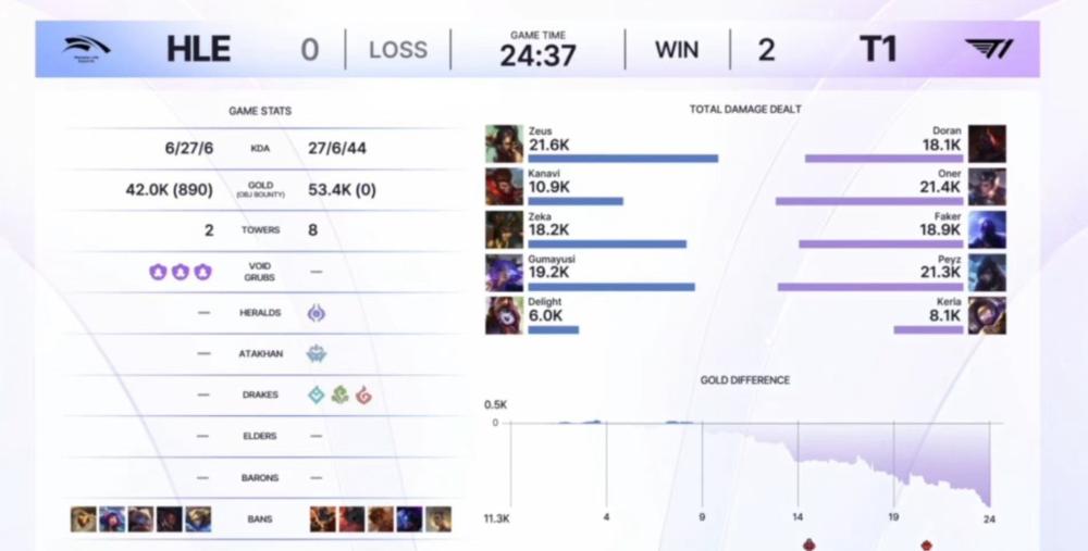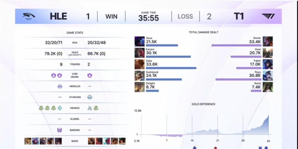 決賽前,HLE因吸納了T1前核心選手Zeus和Gumayusi被戲稱為“銀河戰艦”,而T1在轉會期放走冠軍AD后引入新人Peyz的舉動一度引發質疑。但比賽進程出乎所有人預料:T1開局勢如破竹,連續兩局碾壓HLE。首局Keria的牛頭多次精準開團,第二局他的機器人更是鉤穿HLE下路,讓老隊友Gumayusi毫無游戲體驗。