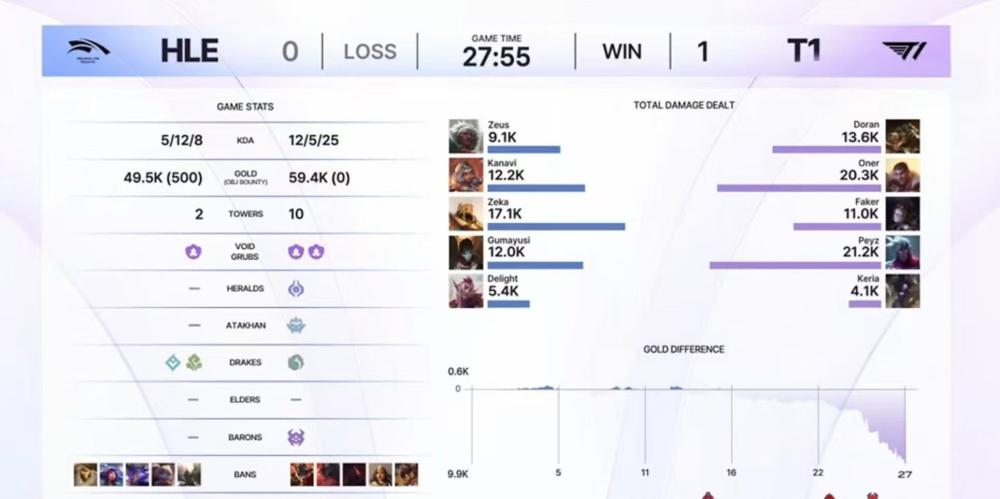第五局成為T1的表演舞臺。從BP階段開始,HLE選出卡薩丁與蒙多組成的后期陣容,而T1則拿出前期強勢的夢魘與澤麗組合。Oner的夢魘從開局便頻繁針對中路,6級后連續針對Zeka的卡薩丁,徹底壓制其發育。同時,T1將下路雙人組調至中線,由Peyz的澤麗配合Keria的貓咪連續擊殺Gumayusi的盧錫安。