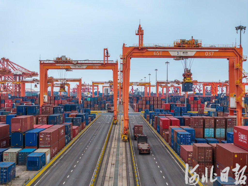 10月23日,在唐山港京唐港區集裝箱碼頭堆場,集裝箱運輸車在裝卸貨物。 河北日報記者趙杰攝