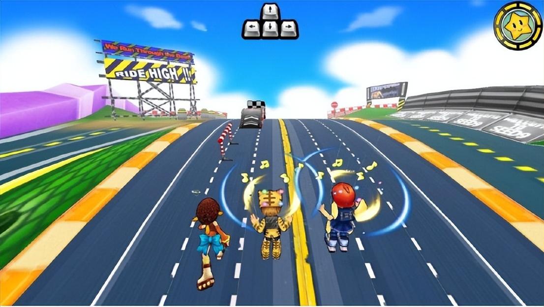 同樣得益于這套被融入進來的競速系統,《音速覺醒》得以在傳統音游四向按鍵操作的基礎上,添加欄桿(長按方向鍵↑ + ←/→空格),跳臺(二段跳雙擊方向鍵↑),轉向滑板(隨機鍵組合長按方向鍵↓ + ←/→)等一系列特技動作,既豐富了游戲的視聽體驗,又增加了游戲操作難度的上限……呃,在某種程度上也是為它最終命運埋下了小小的伏筆。