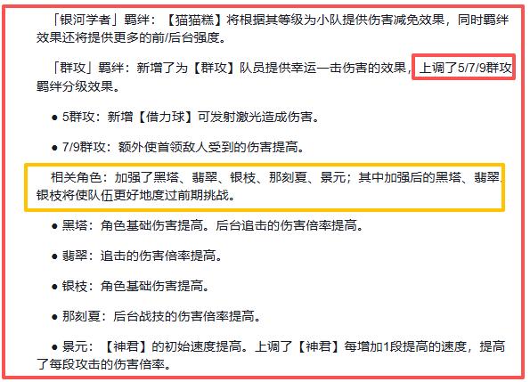 第一個:增強了列車同行、貝洛伯格等羈絆,這種提高還是相當合理的,特別是第三輪次和高難度回合,總不能天天望著去湊阿雅的高速鞋,天胡開局不成就坐等被按在地上摩擦,多個羈絆增強,就多種玩法。