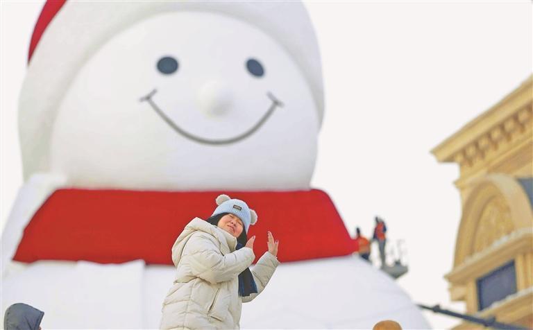 14日,哈爾濱市音樂(lè)公園音樂(lè)長(zhǎng)廊下,備受矚目的大雪人建設(shè)接近尾聲。頂流大雪人戴著紅帽子、系著紅圍脖,用那招牌式憨態(tài)可掬的微笑迎接八方來(lái)客。作為松花江畔的冬季標(biāo)志性景觀,大雪人的回歸為冰城增添了更多童話色彩,吸引眾多市民游客前來(lái)打卡留念。