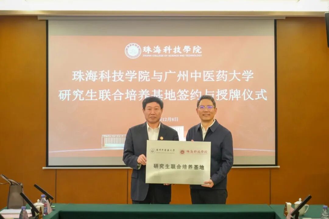 ■12月8日,珠??萍紝W院與廣州中醫藥大學舉行研究生聯合培養基地簽約暨授牌儀式。此次合作,珠海科技學院為研究生提供免費住宿及科研生活補貼,全面保障學習與科研條件;設立專職聯絡員,負責聯合培養學生的日常管理與服務,并在廣中醫統一指導下完成培養審核與實踐考核。此外還將推動人才雙向流動,廣中醫將向學校推薦優秀畢業生,進一步增強校際協作活力,并選派專家與學校骨干教師組成雙導師團隊共享培養方案與教學資源。通過基地建設,雙方將持續整合優勢資源,優化高層次中醫藥人才培養體系,共同為中醫藥事業傳承創新與灣區發展注入智慧與活力。