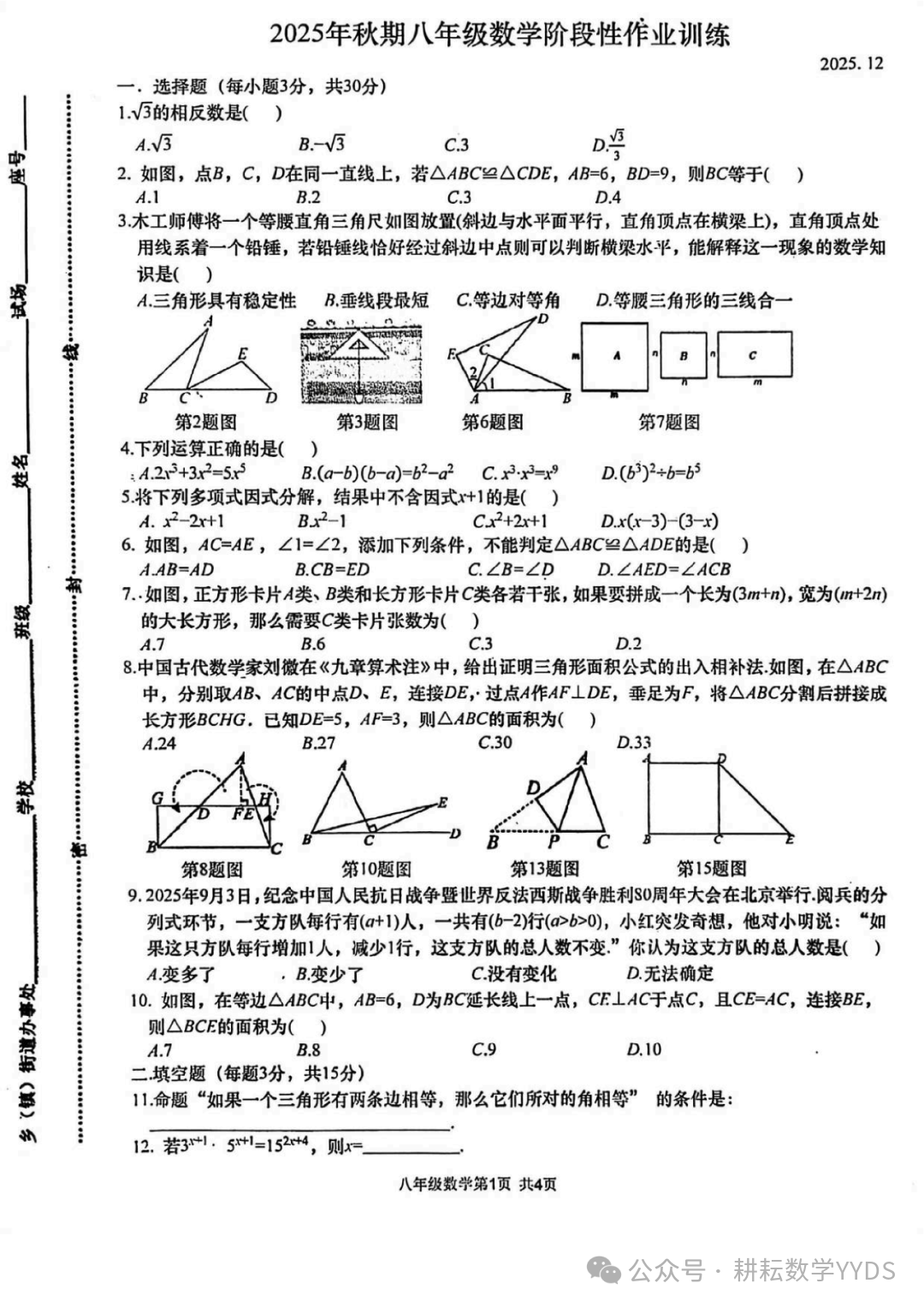 南陽市鎮平縣2025-2026學年上學期第三次月考試八年級數學試卷