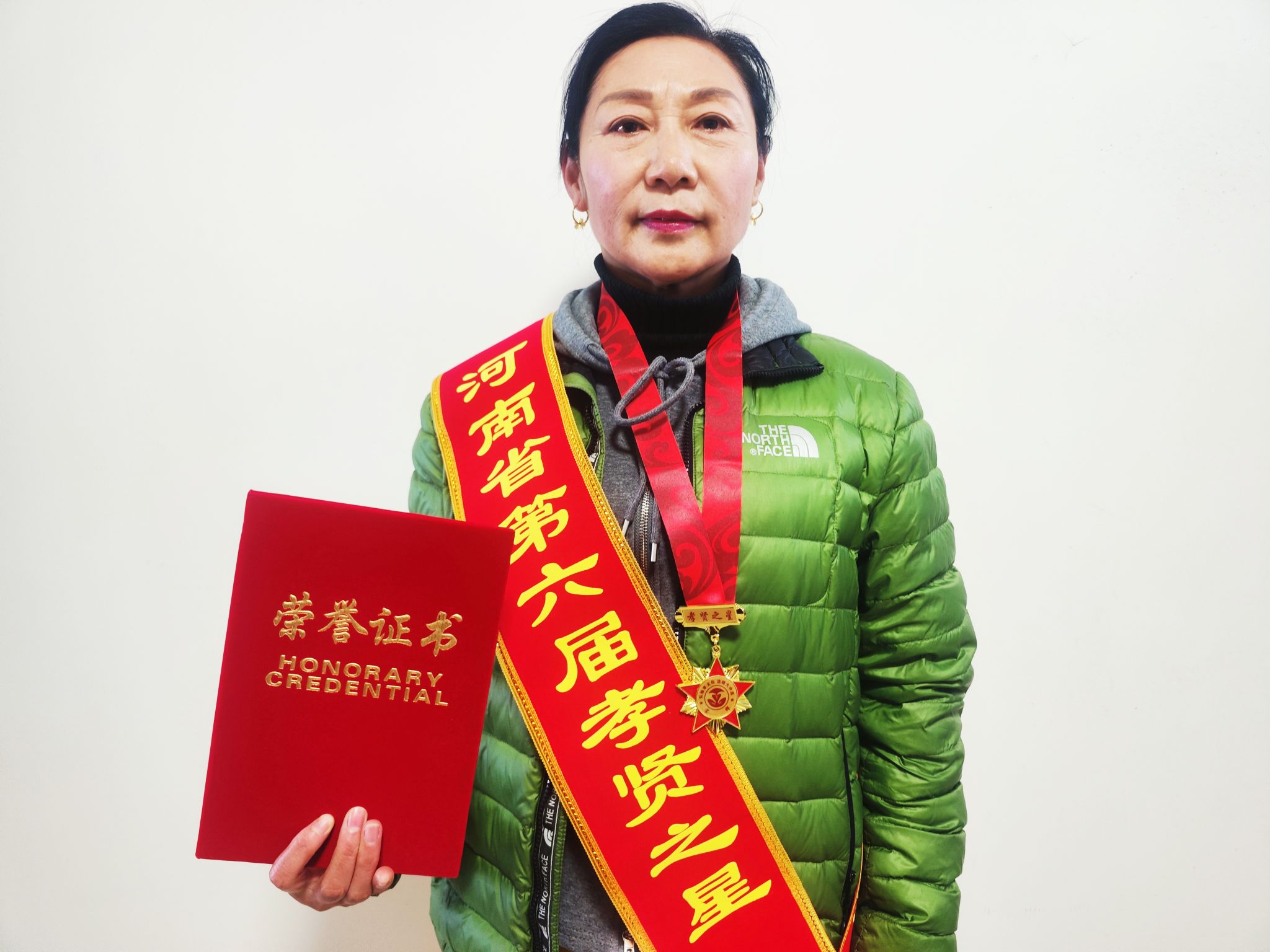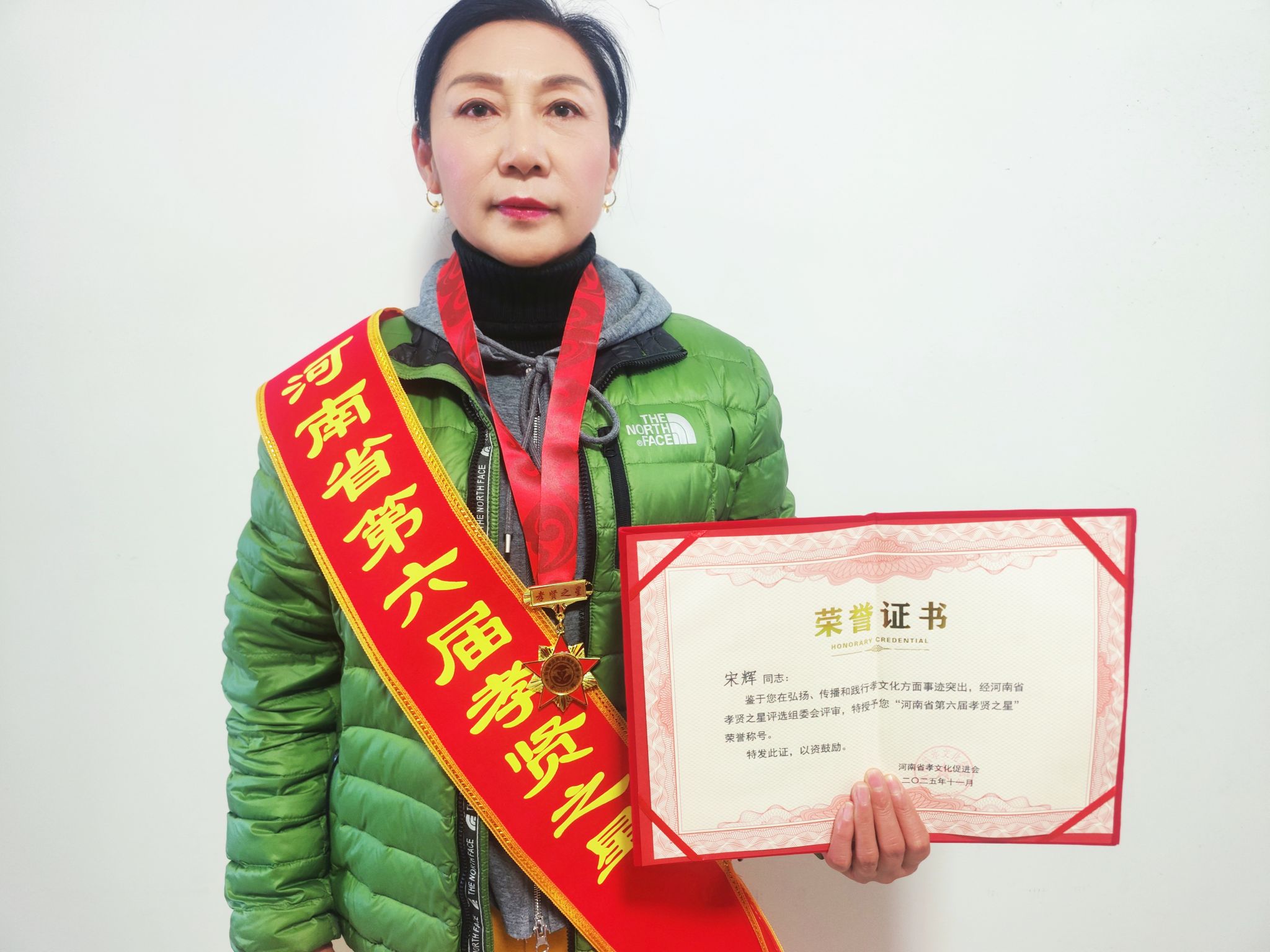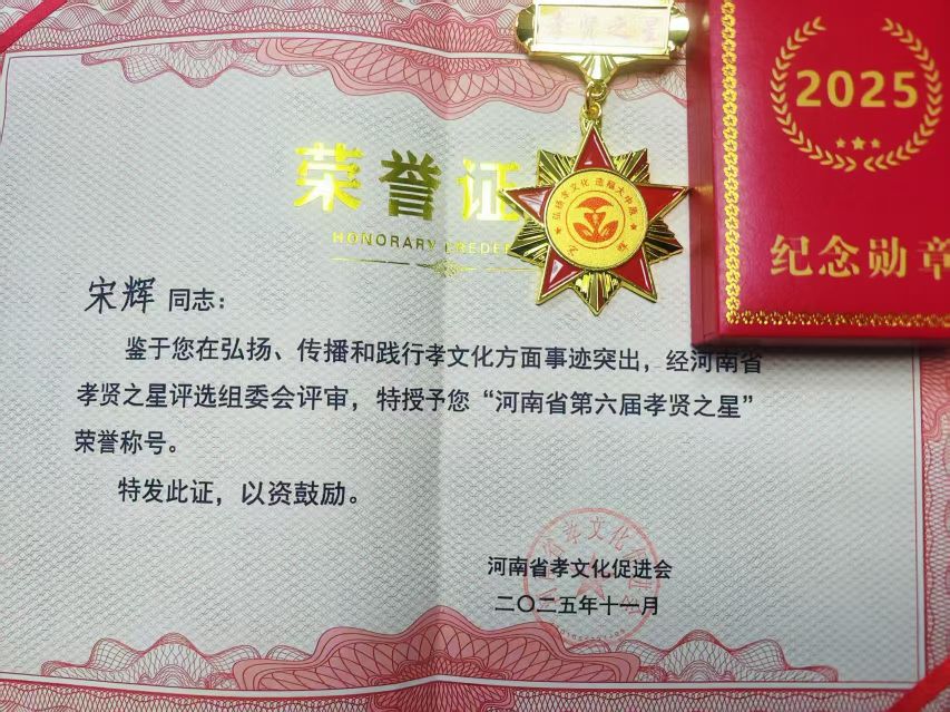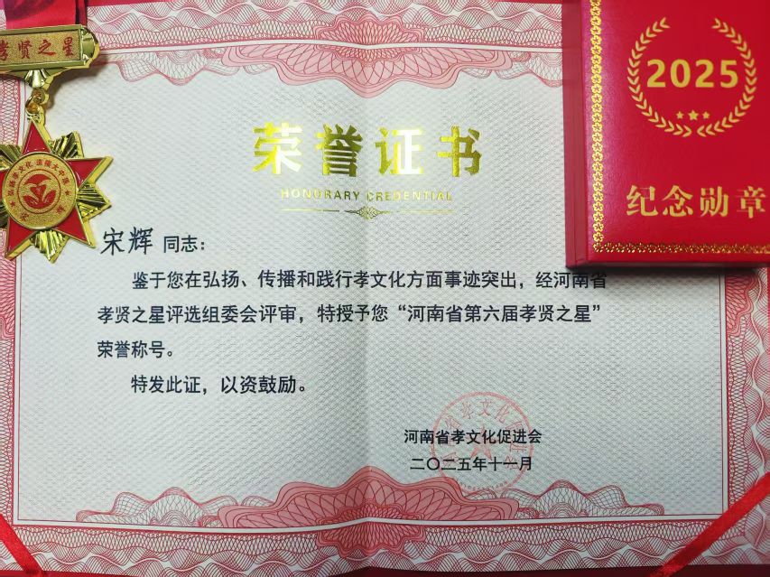 12月13日上午,一本紅紅的燙金的榮譽證書,一個裝有紀念勛章的制式精美紅色小盒,還有上寫“河南省第六屆孝賢之星”的榮譽綬帶,一同郵寄到淮陽區淮寧街道辦宋輝的手中。至此,這個在周口市千萬人口當中唯一榮獲“孝賢之星”省級榮譽獎的事劃上一個句號。