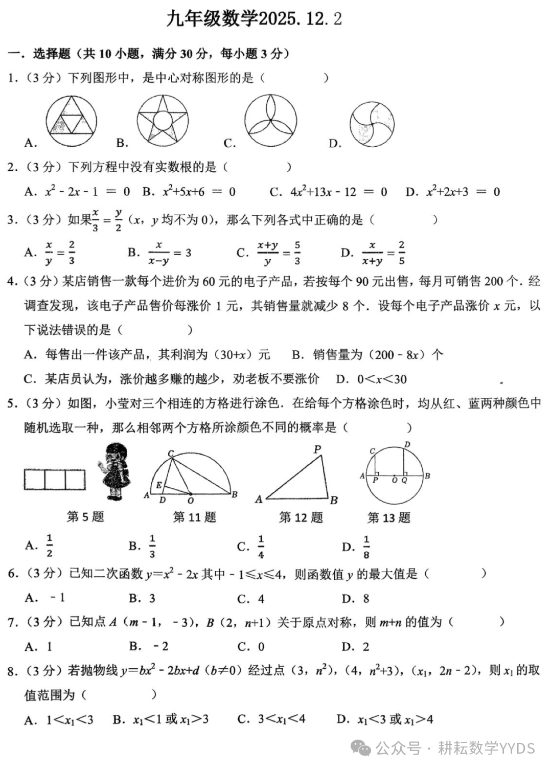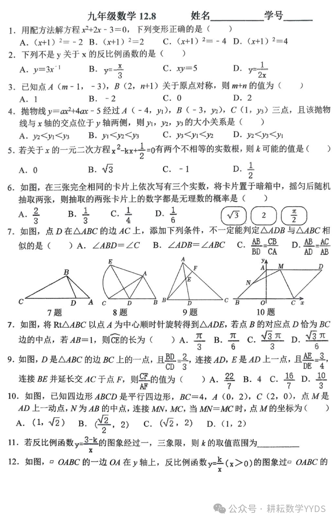 河南省信陽市浉河中學2025-2026學年九年級上學期數學周測卷12.8