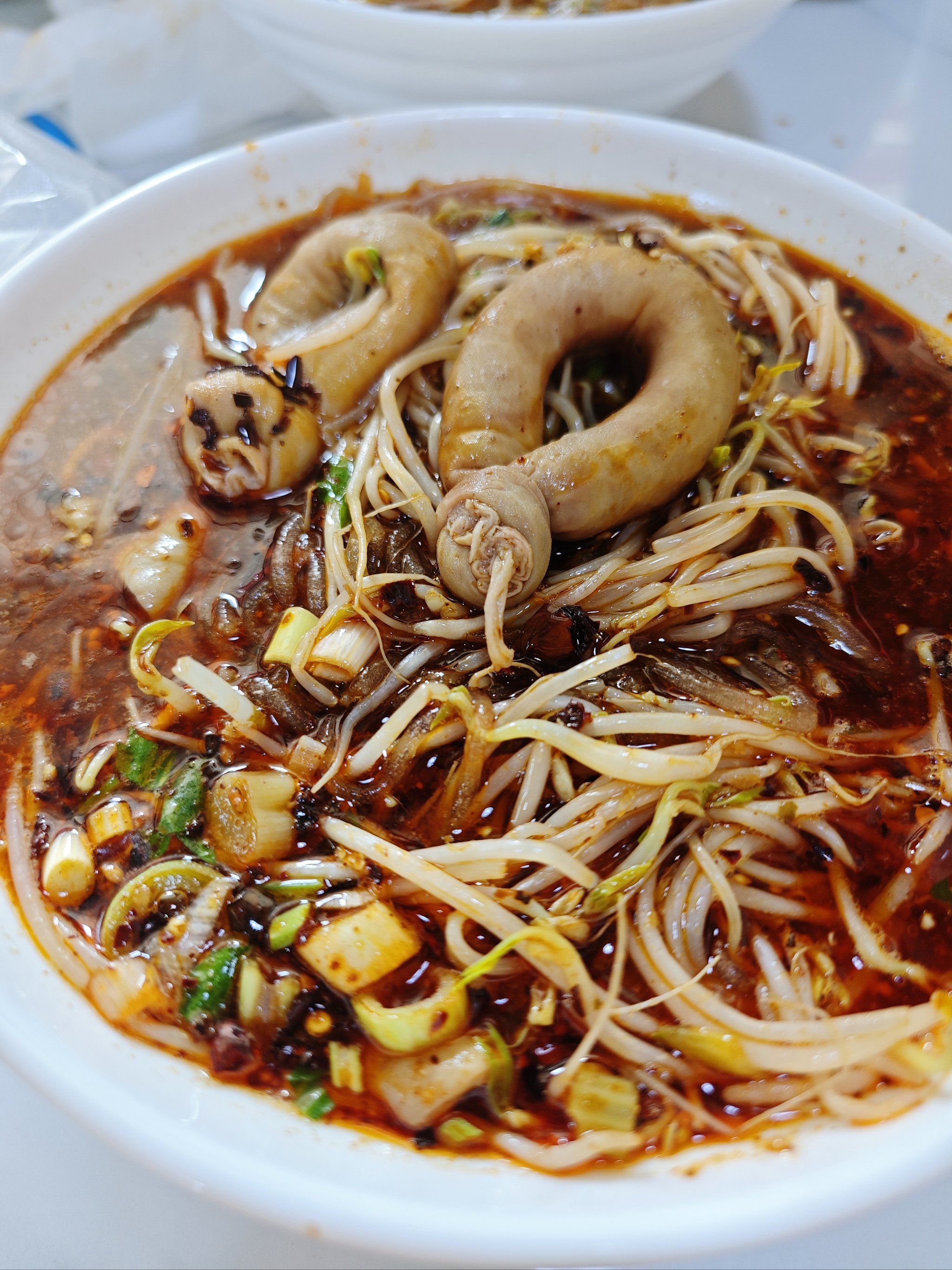 肥腸洗凈加八角花椒燉爛,紅薯粉燙熟,澆上高湯撒蔥花,再淋勺辣子——安逸!