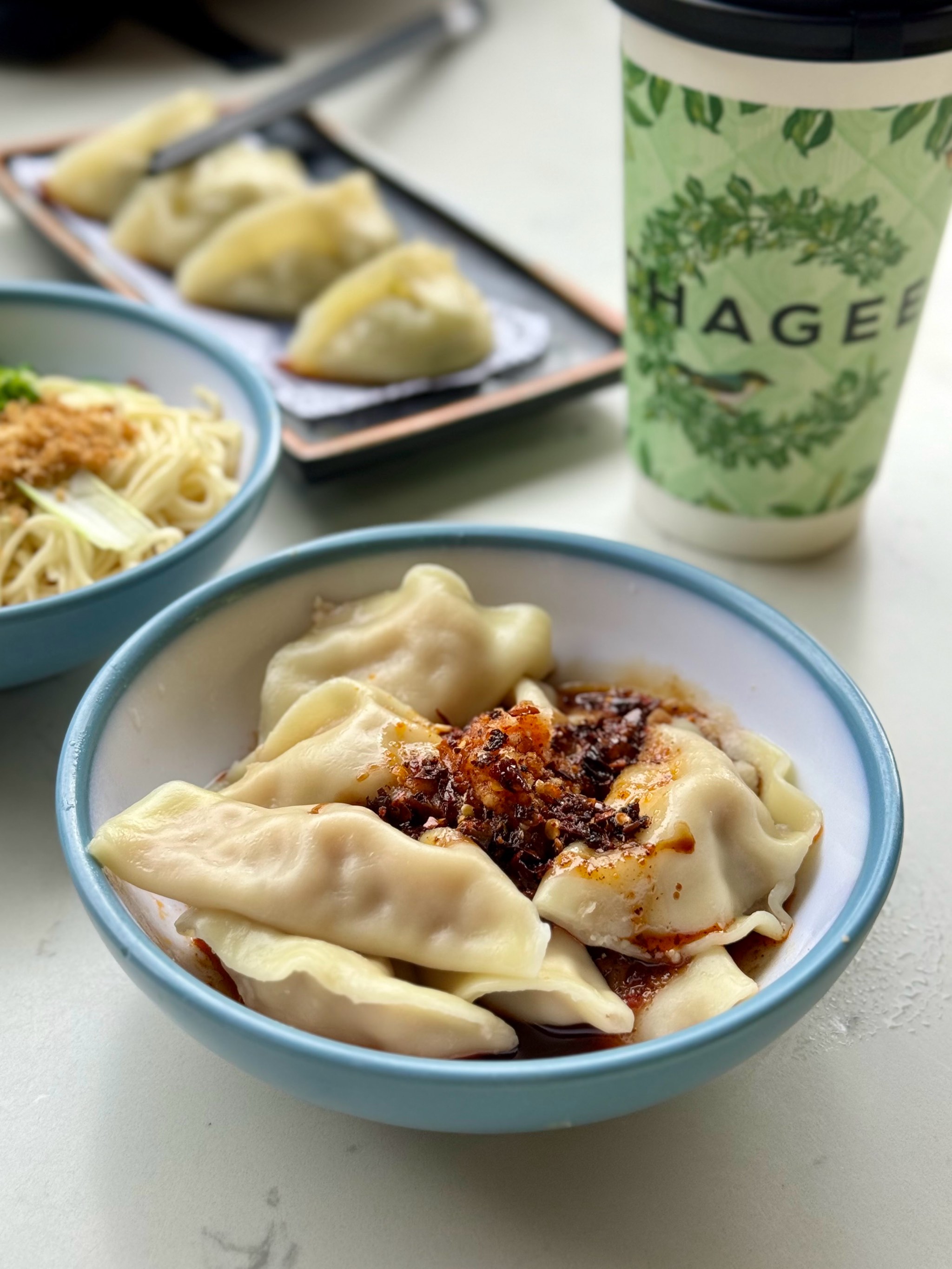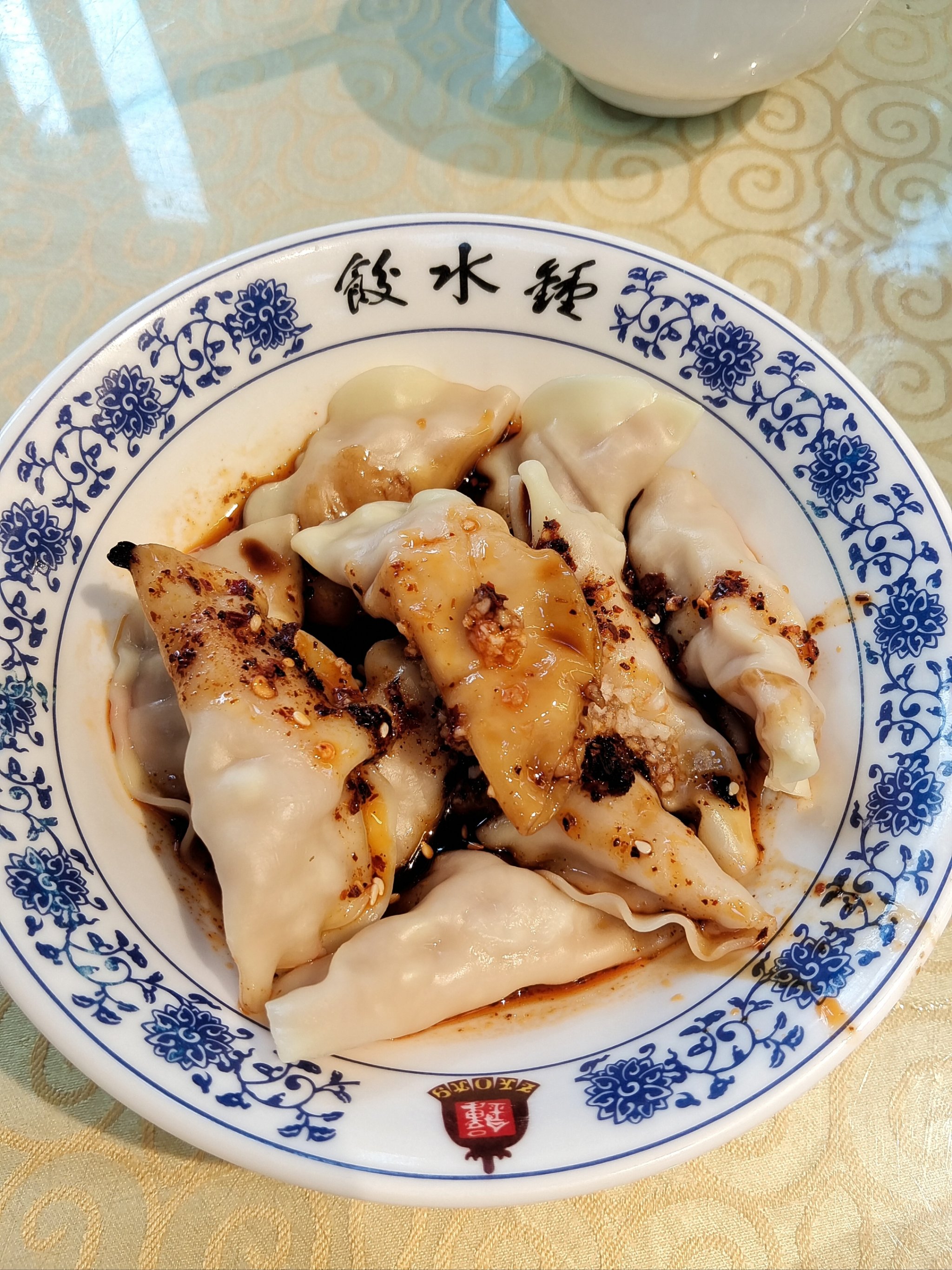 餃子煮到浮起就撈,淋上紅油汁,配碗熱餃子湯,