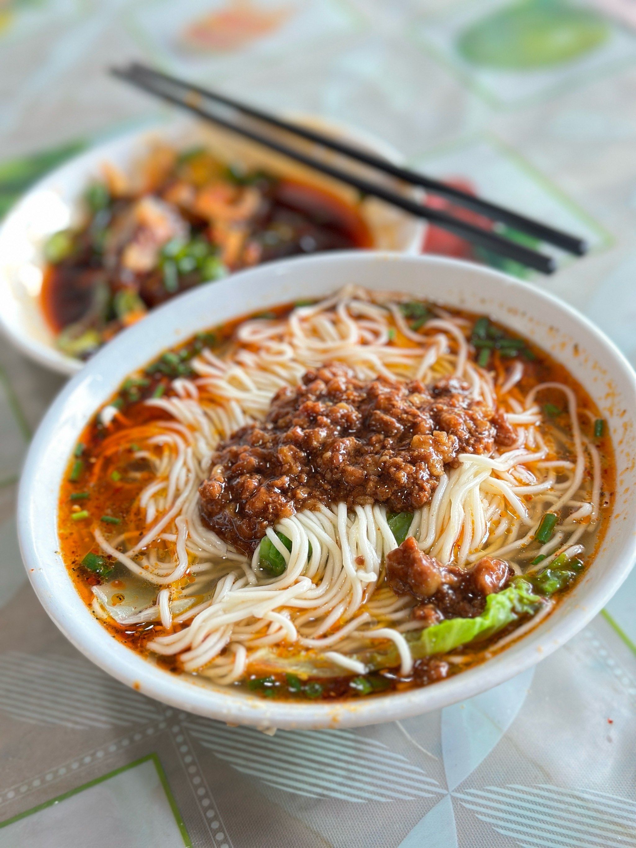 手工面筋道彈牙,吸飽了芝麻醬的濃香、芽菜的脆爽、紅油的麻香,肉臊子油潤金黃,拌開后香氣直往鼻子里鉆。