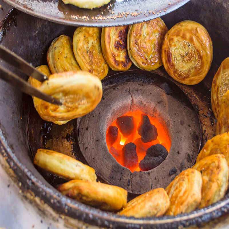 半發面揉至柔韌,抹油酥、鋪肉餡,卷成千層再煎烤,外酥內軟,麻香回甜。