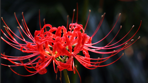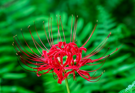 它的神奇先顯于形態(tài):殷紅花瓣反卷如燃盡的絲絨,纖長花蕊直指蒼穹,花莖空挺無葉,宛如孤魂擎起的火燭。古人喚它“鬼擎火”,正因它常生于荒冢與溪澗,花葉永不相見的特性更添詭譎——花開時葉已枯,葉生時花已謝,仿佛被天道刻下永恒的別離咒。