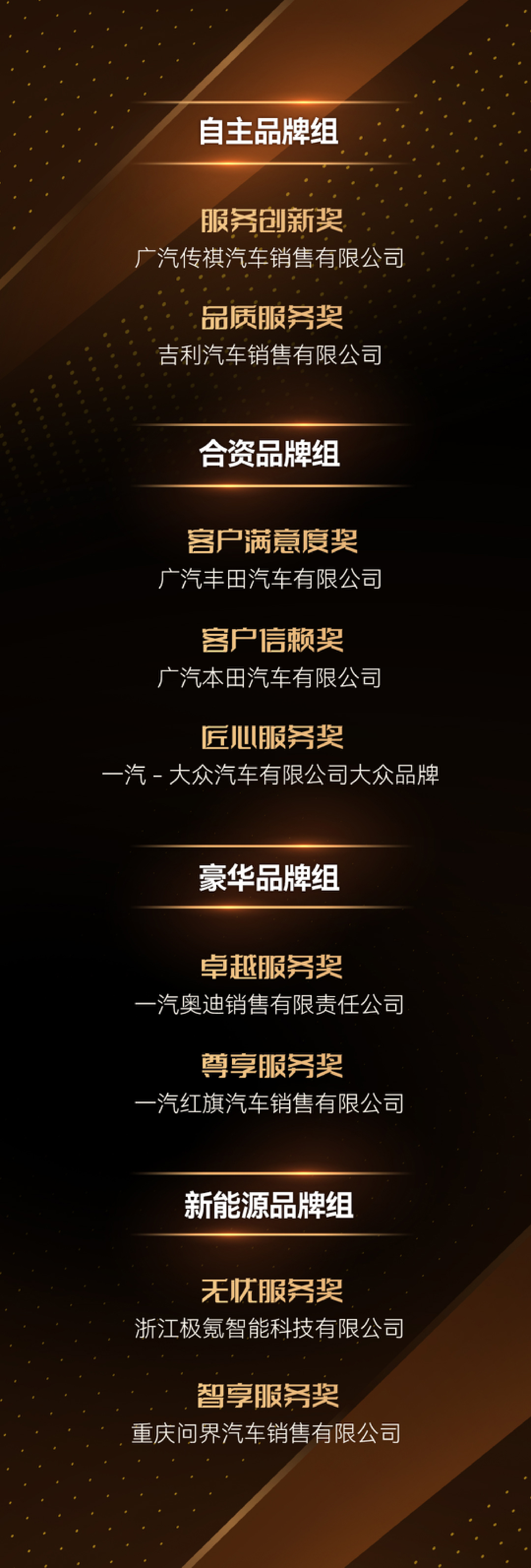 本次評選設置自主品牌、合資品牌、豪華品牌、新能源品牌四大組別。廣汽傳祺、吉利汽車分獲自主品牌組年度獎項;廣汽豐田、廣汽本田、一汽-大眾大眾品牌拿下合資品牌組相關榮譽;豪華品牌組獎項由一汽奧迪、一汽紅旗摘得;新能源品牌組中,極氪與問界憑借優質服務脫穎而出。