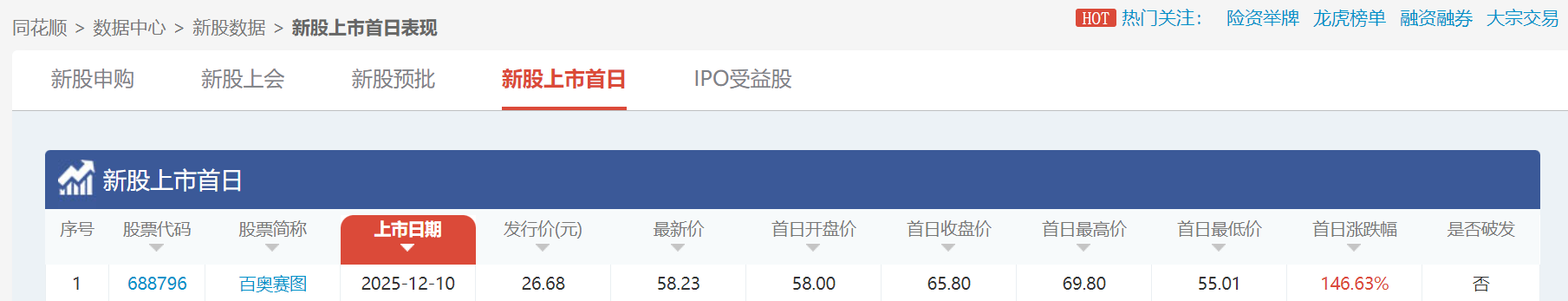 回顧上周(12月8日—12月12日),A股迎來了1只“新成員”,百奧賽圖登陸科創板大漲146.63%。