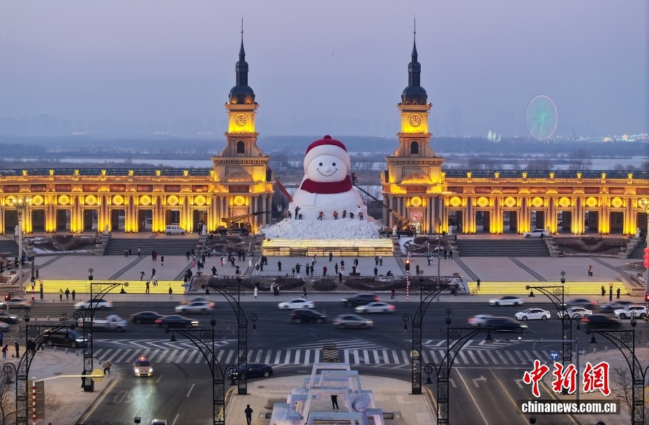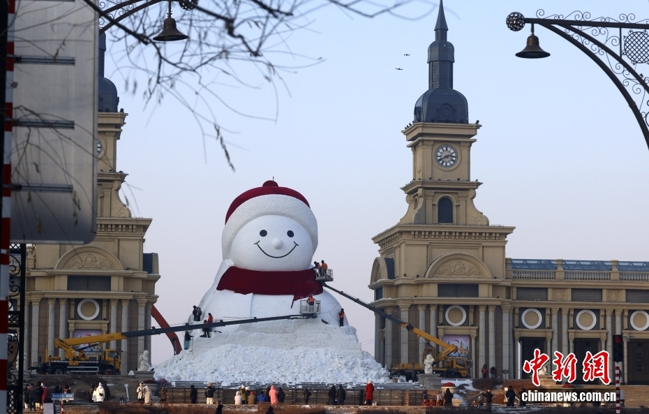 12月14日,黑龍江省哈爾濱市,音樂公園音樂長廊下,備受矚目的網紅大雪人景觀已接近完工。