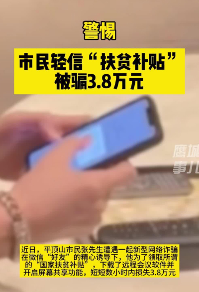 近日,市民張先生遭遇一起新型網絡詐騙:在微信“好友”的精心誘導下,他為了領取所謂的“國家扶貧補貼”,下載了遠程會議軟件并開啟屏幕共享功能,短短數小時內損失3.8萬元。