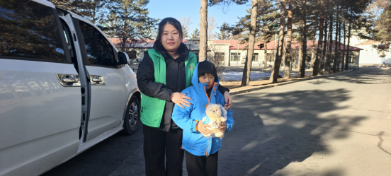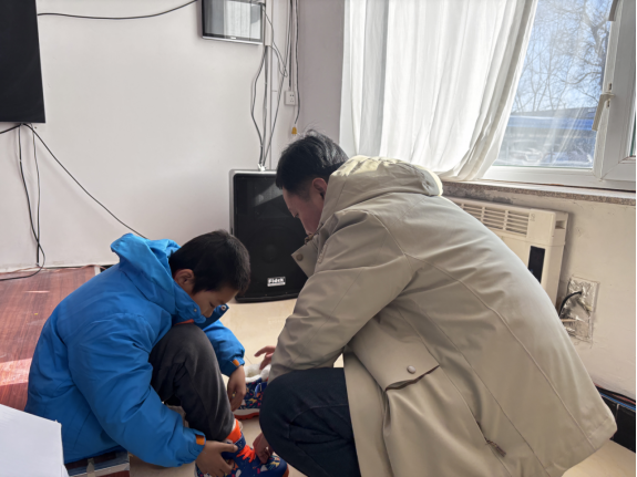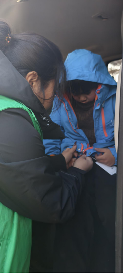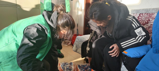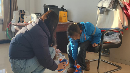 隨后,志愿者們驅車穿過積雪覆蓋的鄉間小路,抵達蓮花泡,志愿者們此行要為一位生活困難的兒童送去冬日的溫暖。當溫暖包被打開的瞬間,映入眼簾的是嶄新的沖鋒衣,志愿者細心為女孩試穿新衣服、新棉鞋,鞋子的厚度足以抵御北方嚴寒。女孩輕聲說道:"謝謝叔叔阿姨,這鞋子真暖和。"這句簡單的話語讓志愿者們倍感溫暖,所有的奔波勞累在那一刻都得到了慰藉。臨別時,志愿者們細心叮囑保暖事項,女孩穿著新衣服與志愿者揮手道別。夕陽的余暉灑在她身上,嶄新的冬裝映著雪光,構成這個冬天最溫暖的畫面。