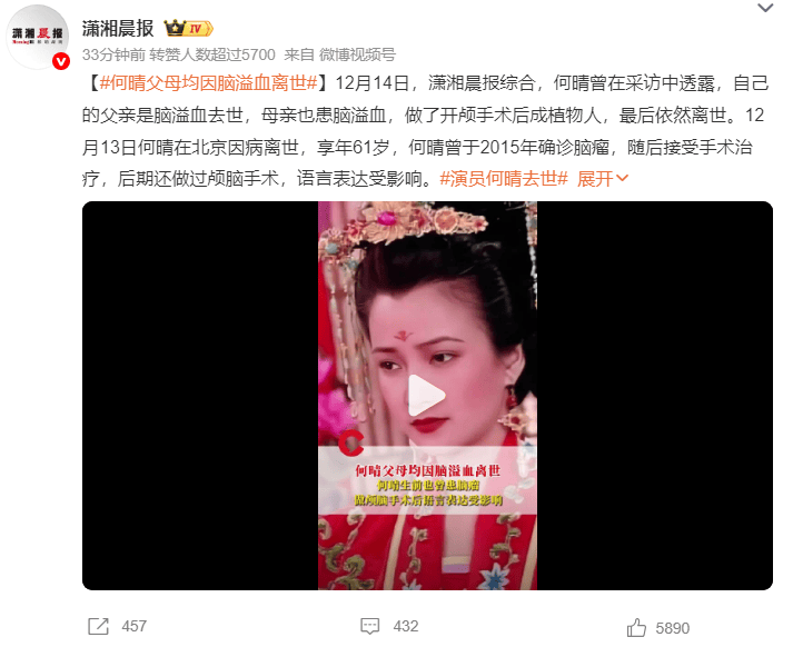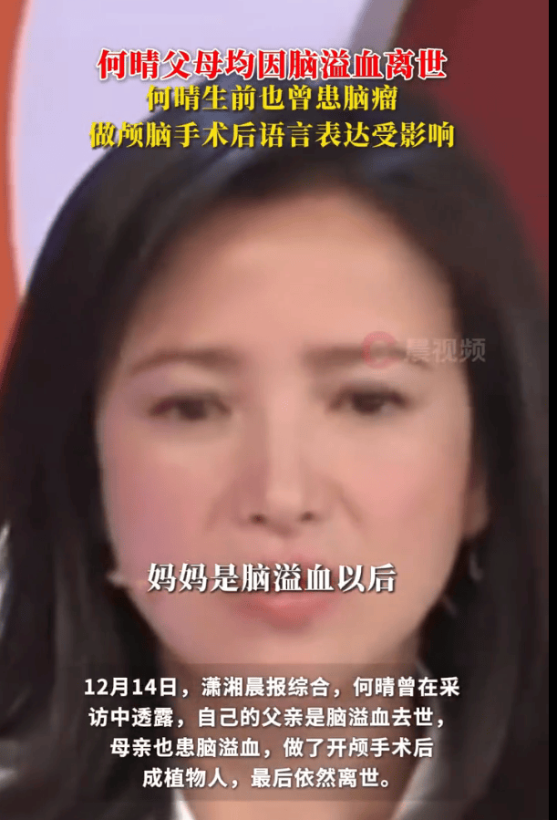 12月14日,瀟湘晨報綜合,何晴曾在采訪中透露,自己的父親是腦溢血去世,母親也患腦溢血,做了開顱手術后成植物人,最后依然離世。12月13日何晴在北京因病離世,享年61歲,何晴曾于2015年確診腦瘤,隨后接受手術治療,后期還做過顱腦手術,語言表達受影響。