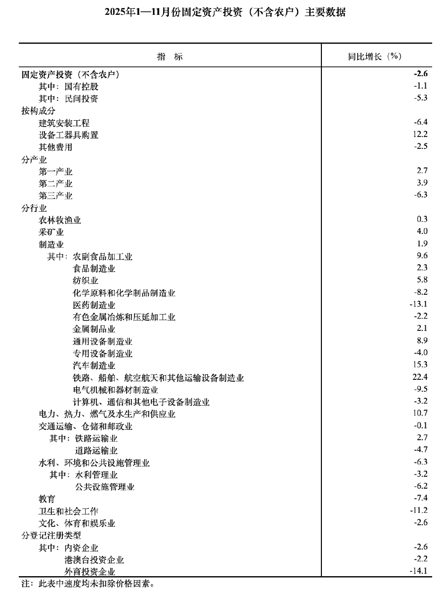 2025年1—11月份,全國固定資產投資(不含農戶)444035億元,同比下降2.6%(按可比口徑計算,詳見附注7)。其中,民間固定資產投資同比下降5.3%。從環比看,11月份固定資產投資(不含農戶)下降1.03%。