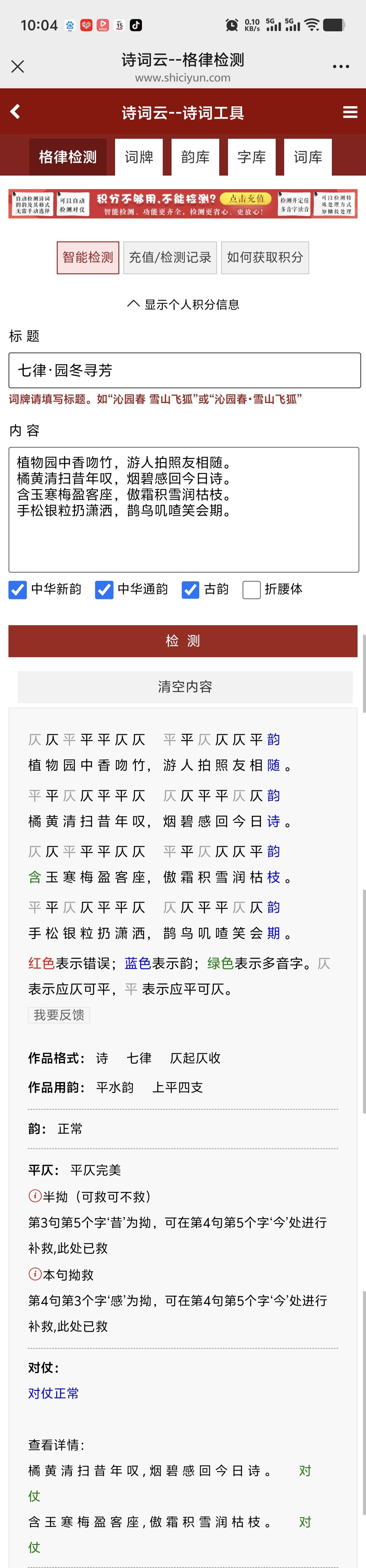 - 如首句“植物園中香吻竹”(仄仄平平平仄仄),“植”“物”“吻”“竹”等仄聲字鏗鏘有力,“中”“香”等平聲字舒緩柔和,平仄相間既貼合“游園”的從容節奏,又以仄聲字的利落避免冬景的拖沓感;