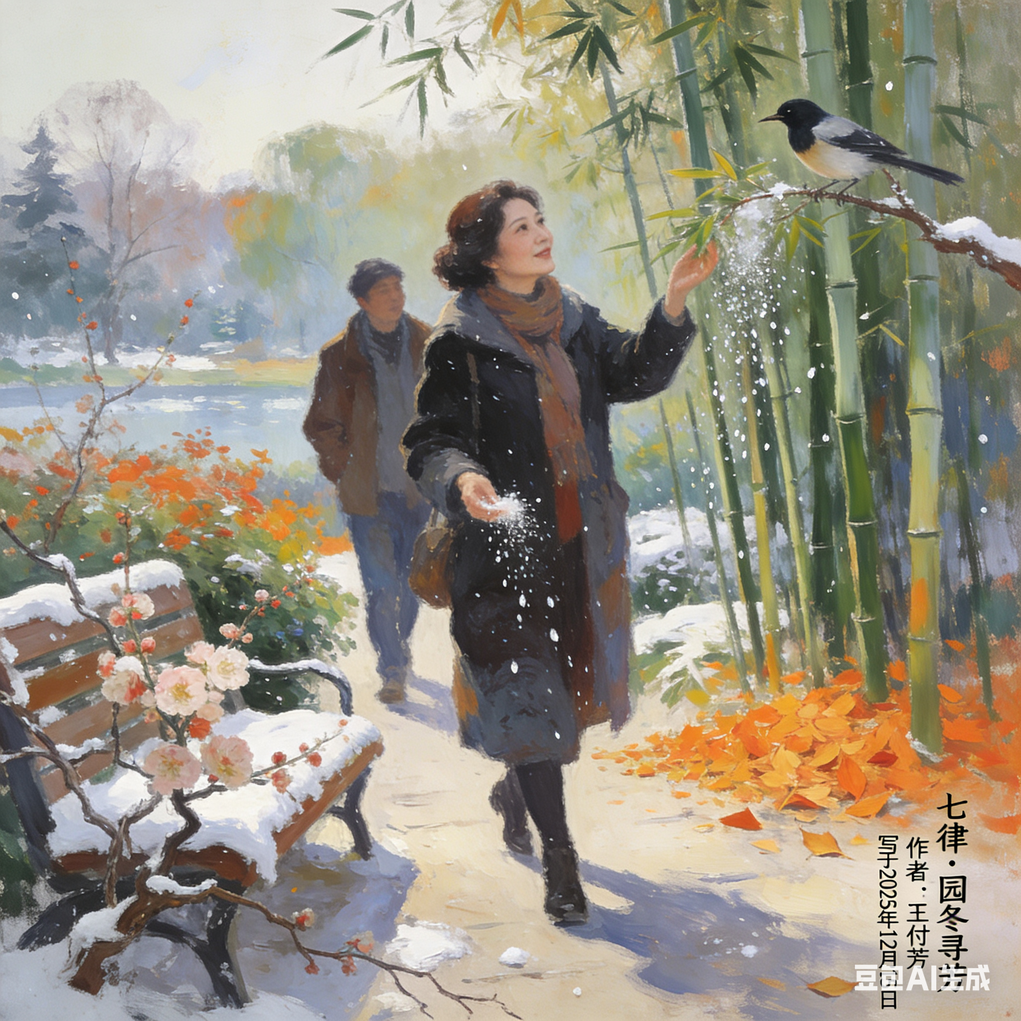 全詩以“尋芳”為題,“芳”既指梅、竹等冬園清景,也指友伴之情、當下之樂與心中詩意。意象選擇皆為冬日常見之物(竹、梅、雪、鵲鳥),但通過“香吻”“含玉”“潤”等字眼的點染,賦予尋常景致靈動氣韻;場景從游園、感懷到嬉戲、期許,脈絡連貫,意境從具象的冬園圖景,延伸至抽象的時光感悟與情感期許,虛實相生,讓讀者既能身臨其境地感受冬日游園之樂,又能體味到藏在景致背后的生活溫情。