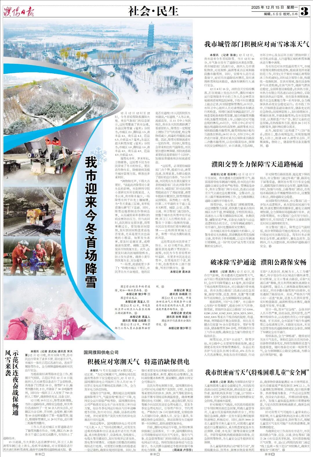12月12日12時至22時,今冬首場雪降落濮陽大地。來自氣象部門的信息顯示,這場雪覆蓋了我市全境,各縣區降雪量(毫米)分別為:市城區2.1、濮陽縣1.5、清豐縣4.6、南樂縣4.2、范縣6.5、臺前縣6.7毫米;各縣區最大積雪深度(厘米)分別為:市城區1.0、濮陽縣1.0、清豐縣4.0、南樂縣4.0、范縣4.0、臺前縣6.0。
